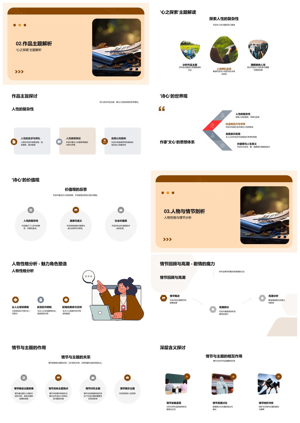 风云办公提供的经典文心人性叙事现代解析PPT模板,下载格式为pptx,一共27页,作品中文字及图均可以修改和编辑,图片更改请在作品中右键图片并更换,文字修改请直接点击文字进行修改。