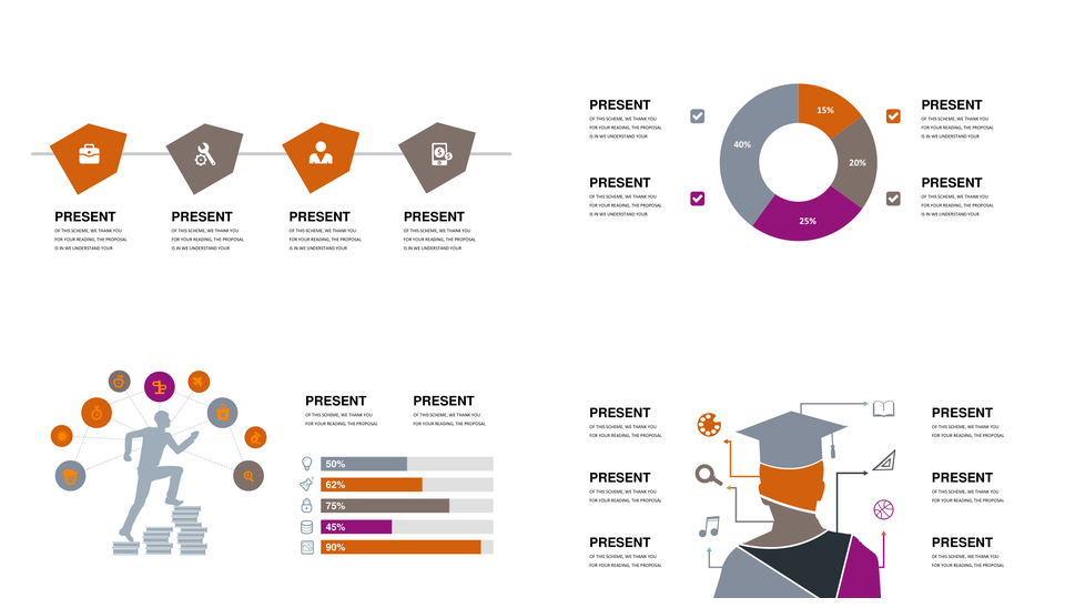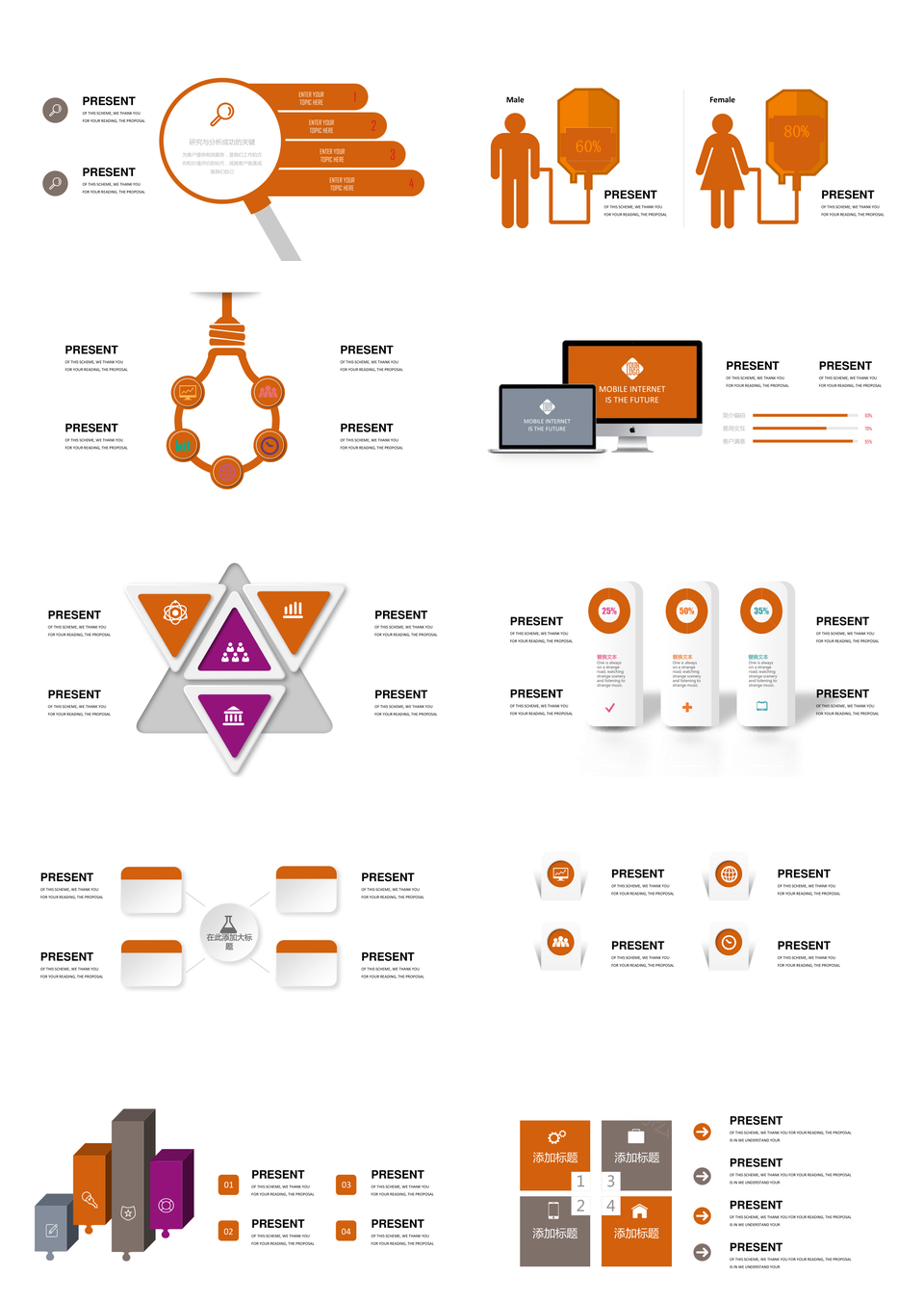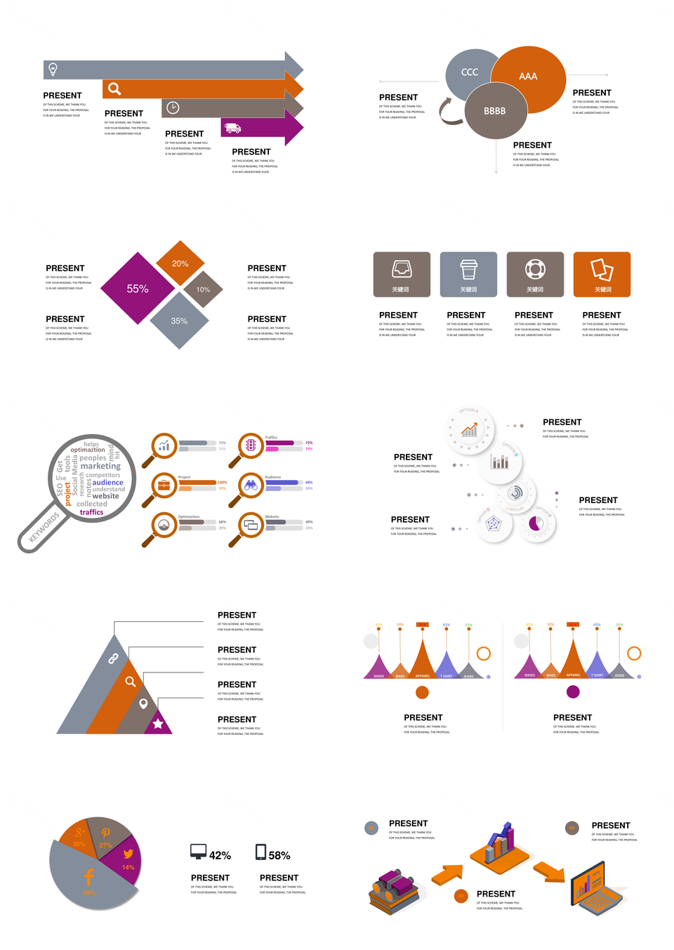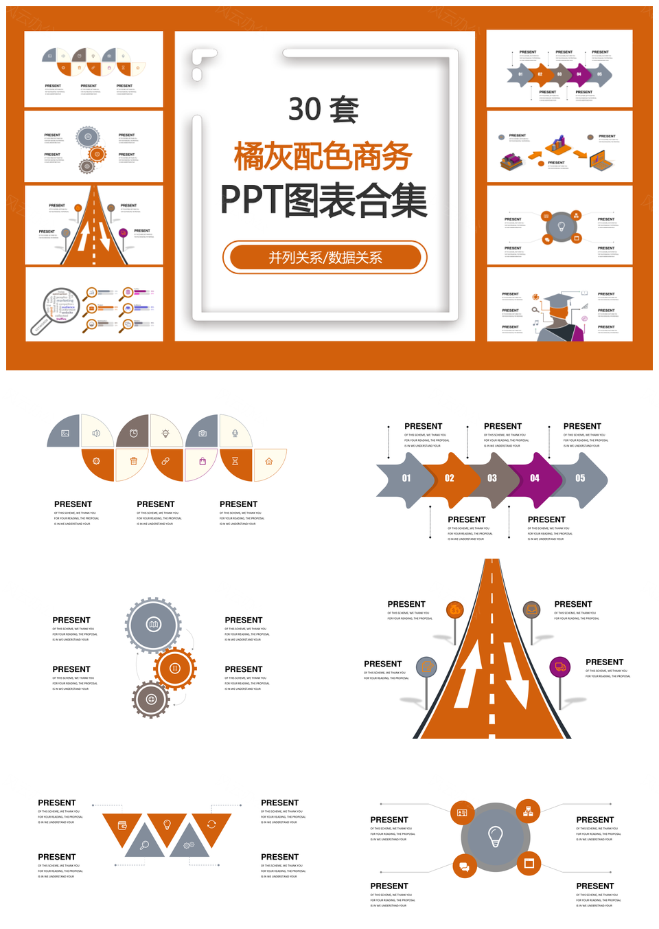这是一张橘灰配色商务并列关系数据关系PPT图表合集,包含橘灰、配色、商务、并列关系、数据关系、图表、合集等主题内容,也可用作橘灰、配色、商务、并列关系、数据关系、PPT图表、合集