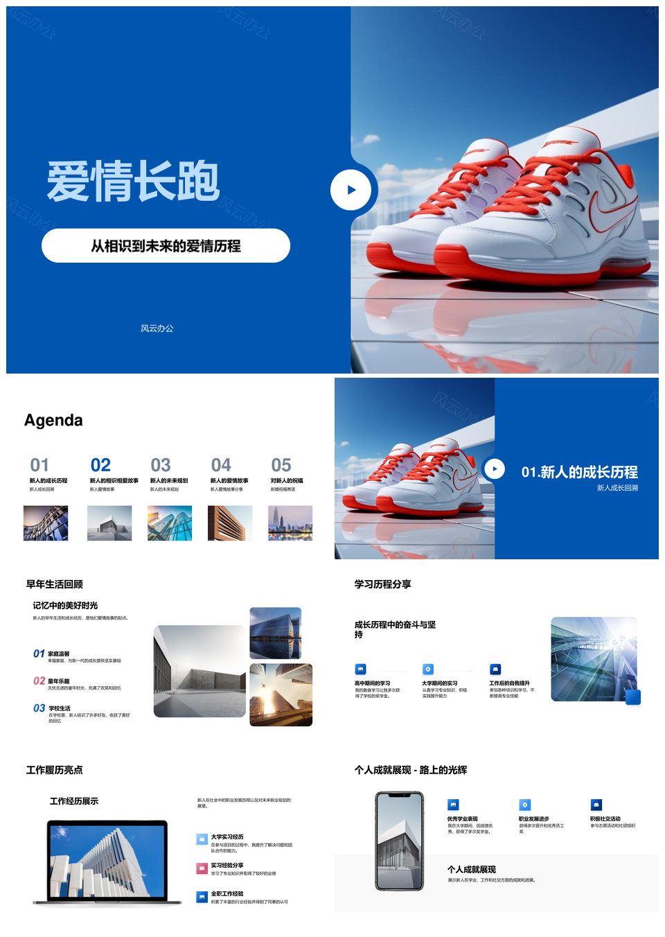 风云办公提供的爱情长跑新人跑鞋见证成长共筑未来PPT模板,下载格式为pptx,一共33页,作品中文字及图均可以修改和编辑,图片更改请在作品中右键图片并更换,文字修改请直接点击文字进行修改。