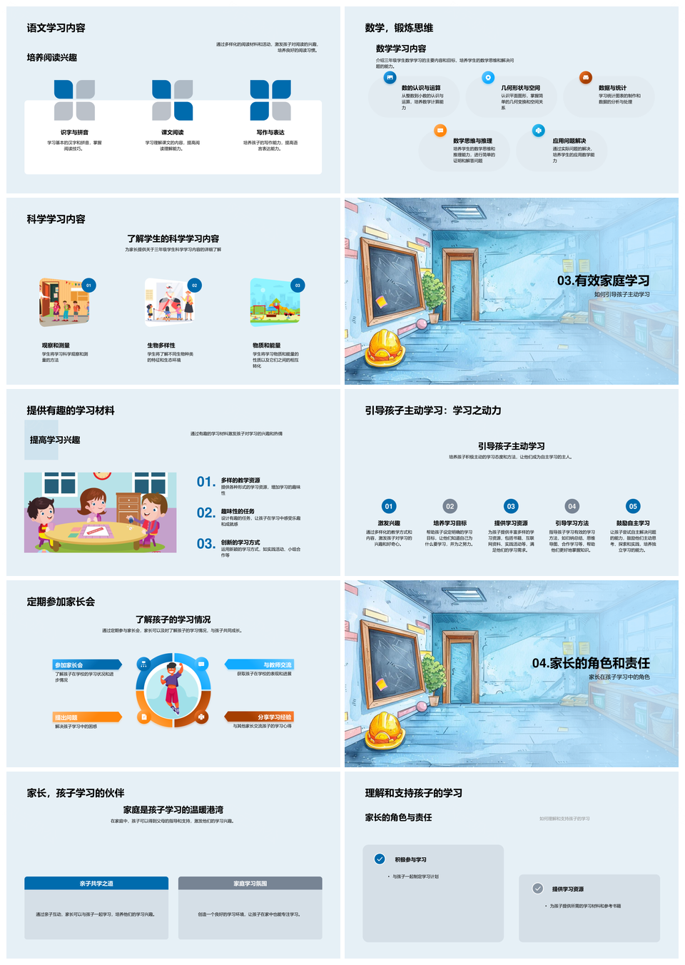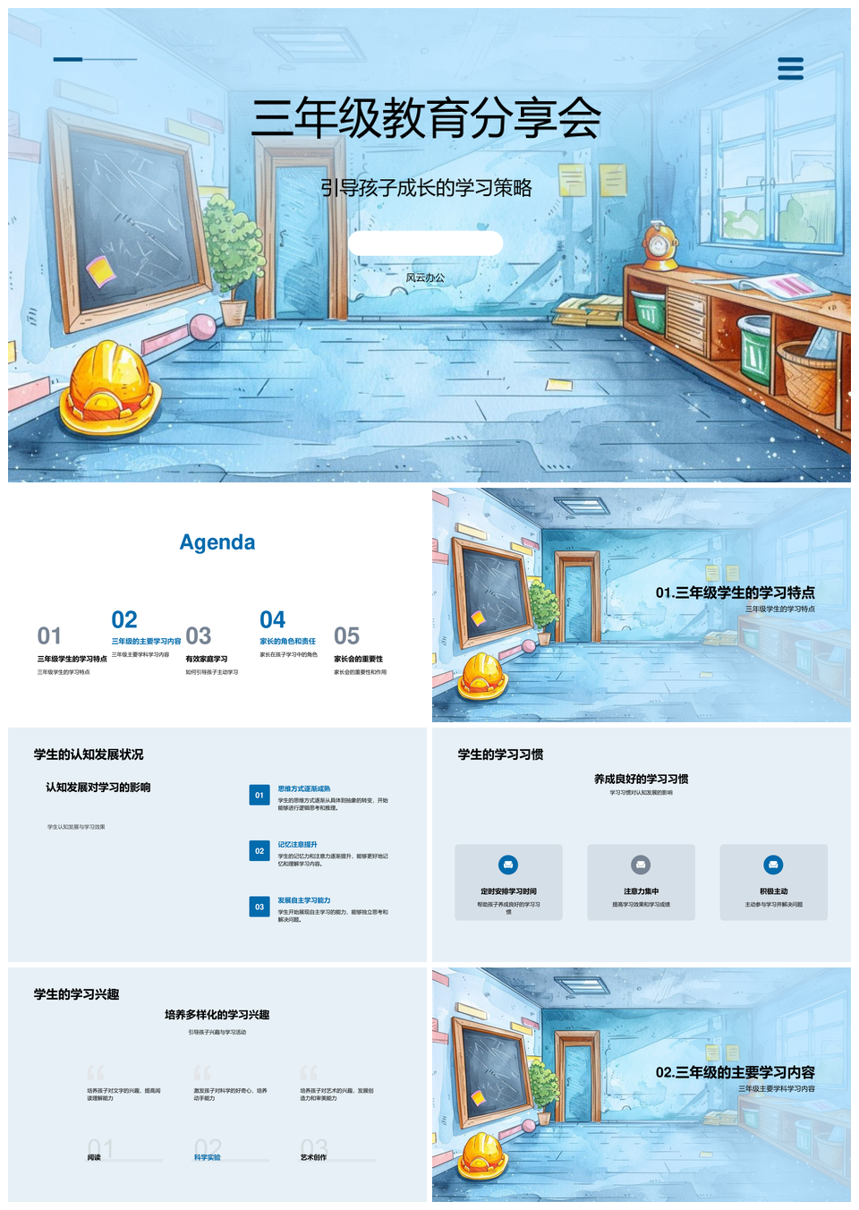 这是一张三年级教育分享会学生学习习惯兴趣语数科引导参与PPT模板,包含三年级、教育分享会、学生、学习习惯、兴趣、语数科、引导、参与等主题内容,也可用作三年级教育分享会学生、教育分享会学生参与、学生学习习惯兴趣引导、语数科引导参与、三年级学生学习习惯兴趣、分享会学生语数科引导、教育引导参与学习习惯、学生兴趣语数科参与、三年级分享会学习习惯、教育兴趣引导参与、语数科学习习惯培养、三年级语数科兴趣培养、学生学习习惯引导、教育分享会语数科、兴趣引导参与等PPT场景使用。 风云办公提供的三年级教育分享会学生学习习惯兴趣语数科引导参与PPT模板,下载格式为pptx,一共23页,作品中文字及图均可以修改和编辑,图片更改请在作品中右键图片并更换,文字修改请直接点击文字进行修改。