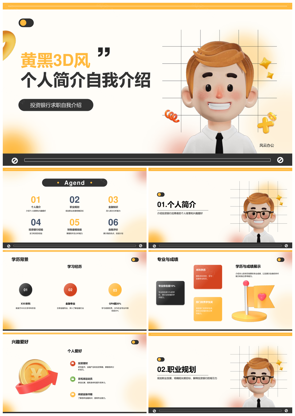 风云办公提供的黄黑3D风个人简介自我介绍PPT模板,下载格式为pptx,一共27页,作品中文字及图均可以修改和编辑,图片更改请在作品中右键图片并更换,文字修改请直接点击文字进行修改。