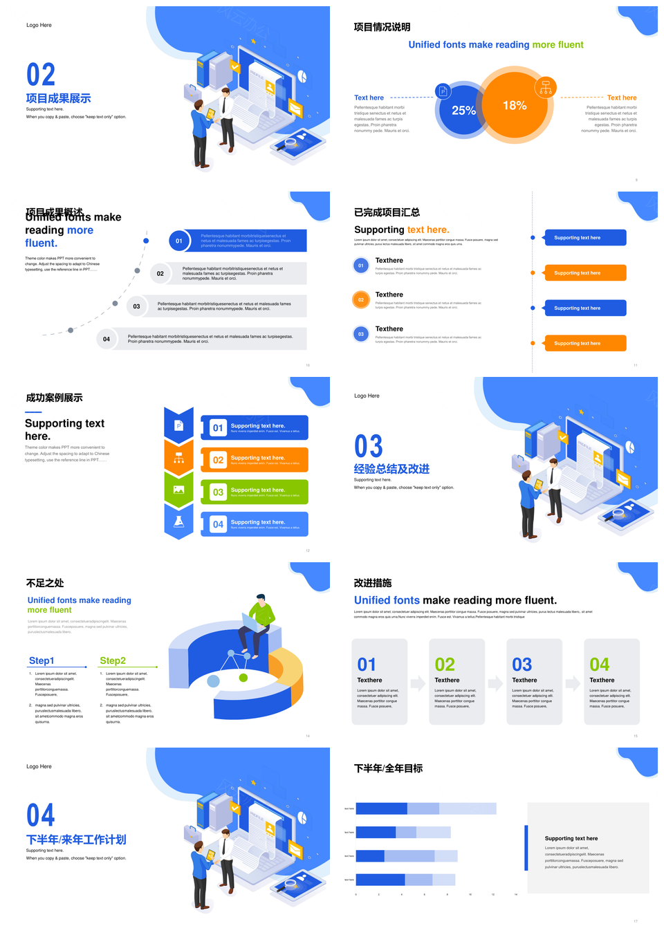 2025蓝色年终总结工作计划商务简约插画风PPT模板