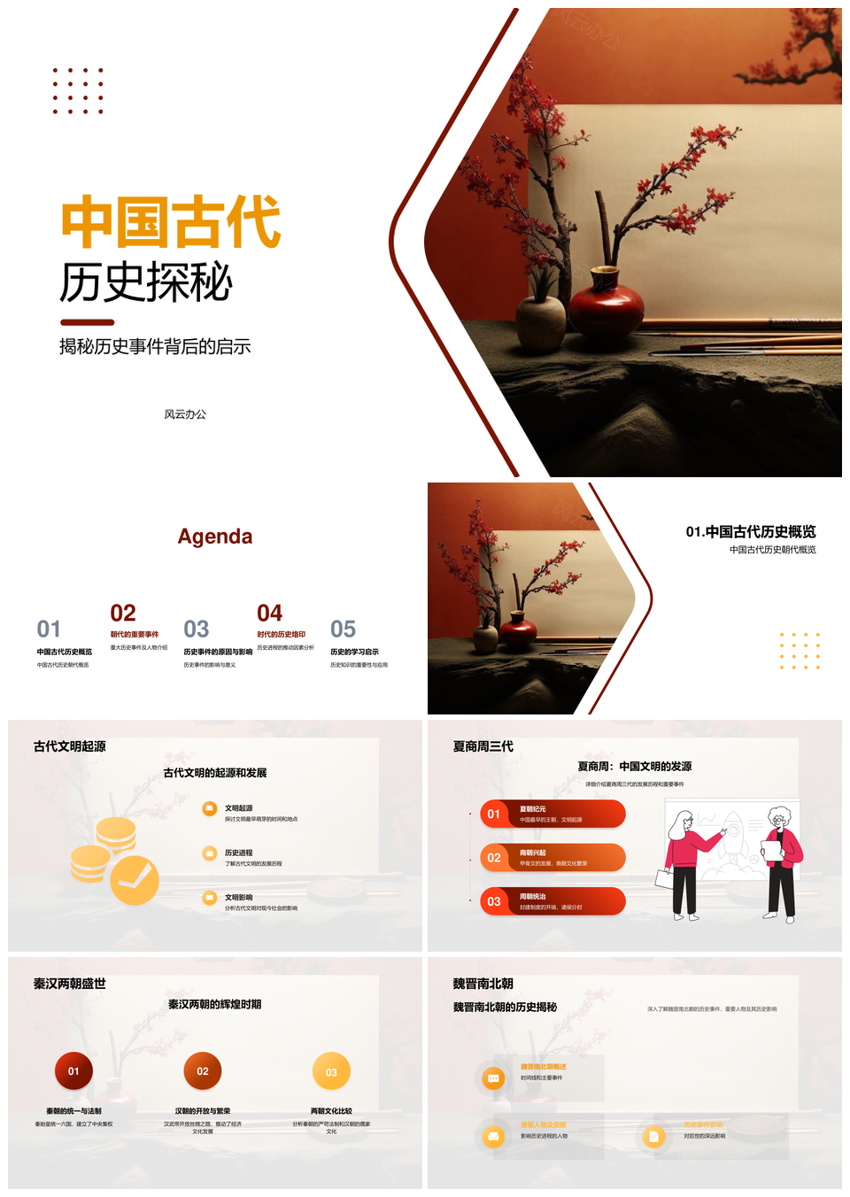风云办公提供的中国古代历史重大事件人物朝代演变PPT模板,下载格式为pptx,一共33页,作品中文字及图均可以修改和编辑,图片更改请在作品中右键图片并更换,文字修改请直接点击文字进行修改。