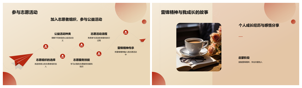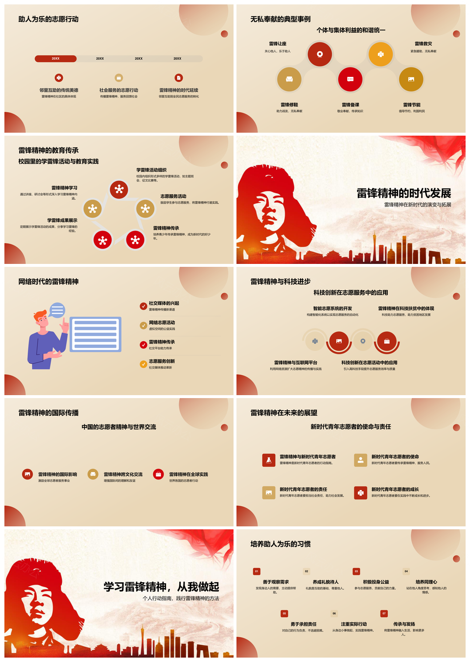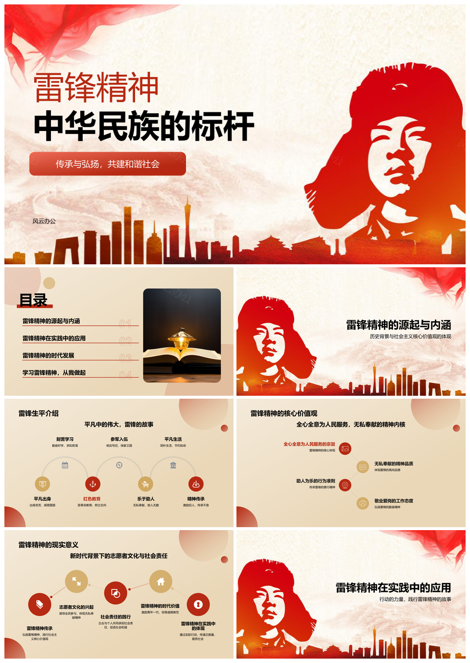 这是一张雷锋精神标杆传承弘扬志愿公益社区服务PPT模板,包含雷锋精神、标杆、传承、弘扬、志愿、公益、社区服务等主题内容,也可用作雷锋精神标杆传承、精神标杆传承弘扬、标杆传承弘扬志愿、传承弘扬志愿公益、弘扬志愿公益社区、志愿公益社区服务、雷锋精神标杆、精神标杆传承、标杆传承弘扬、传承弘扬志愿、弘扬志愿公益、志愿公益社区、公益社区服务、志愿公益、社区服务等PPT场景使用。 风云办公提供的雷锋精神标杆传承弘扬志愿公益社区服务PPT模板,下载格式为pptx,一共20页,作品中文字及图均可以修改和编辑,图片更改请在作品中右键图片并更换,文字修改请直接点击文字进行修改。