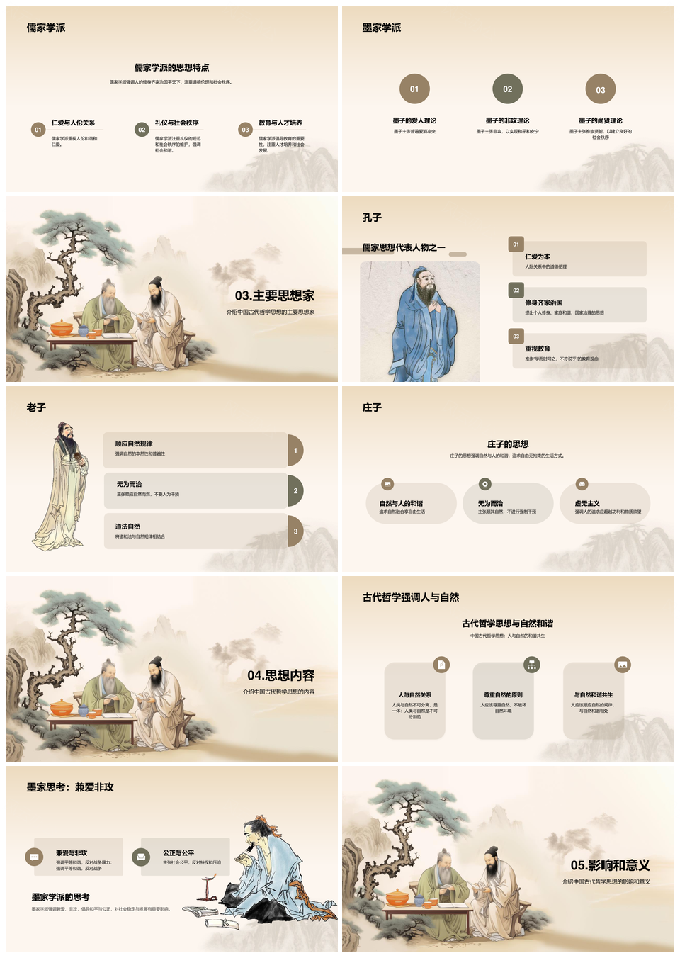这是一张中国古代哲学儒道墨学派起源孔子老子代表人物PPT模板,包含中国古代哲学、儒道墨、学派、起源、孔子、老子、代表人物等主题内容,也可用作中国古代哲学儒道墨学派起源、儒道墨学派起源孔子老子、中国古代哲学代表人物孔子老子、儒道墨学派代表人物孔子老子、中国古代哲学儒道墨学派代表人物、儒道墨学派起源孔子、儒道墨学派起源老子、儒道墨学派代表人物孔子、儒道墨学派代表人物老子、中国古代哲学儒道墨学派、中国古代哲学起源孔子、中国古代哲学代表人物孔子、中国古代哲学代表人物老子、代表人物孔子老子、儒道墨学派孔子老子等PPT场景使用。 风云办公提供的中国古代哲学儒道墨学派起源孔子老子代表人物PPT模板,下载格式为pptx,一共20页,作品中文字及图均可以修改和编辑,图片更改请在作品中右键图片并更换,文字修改请直接点击文字进行修改。