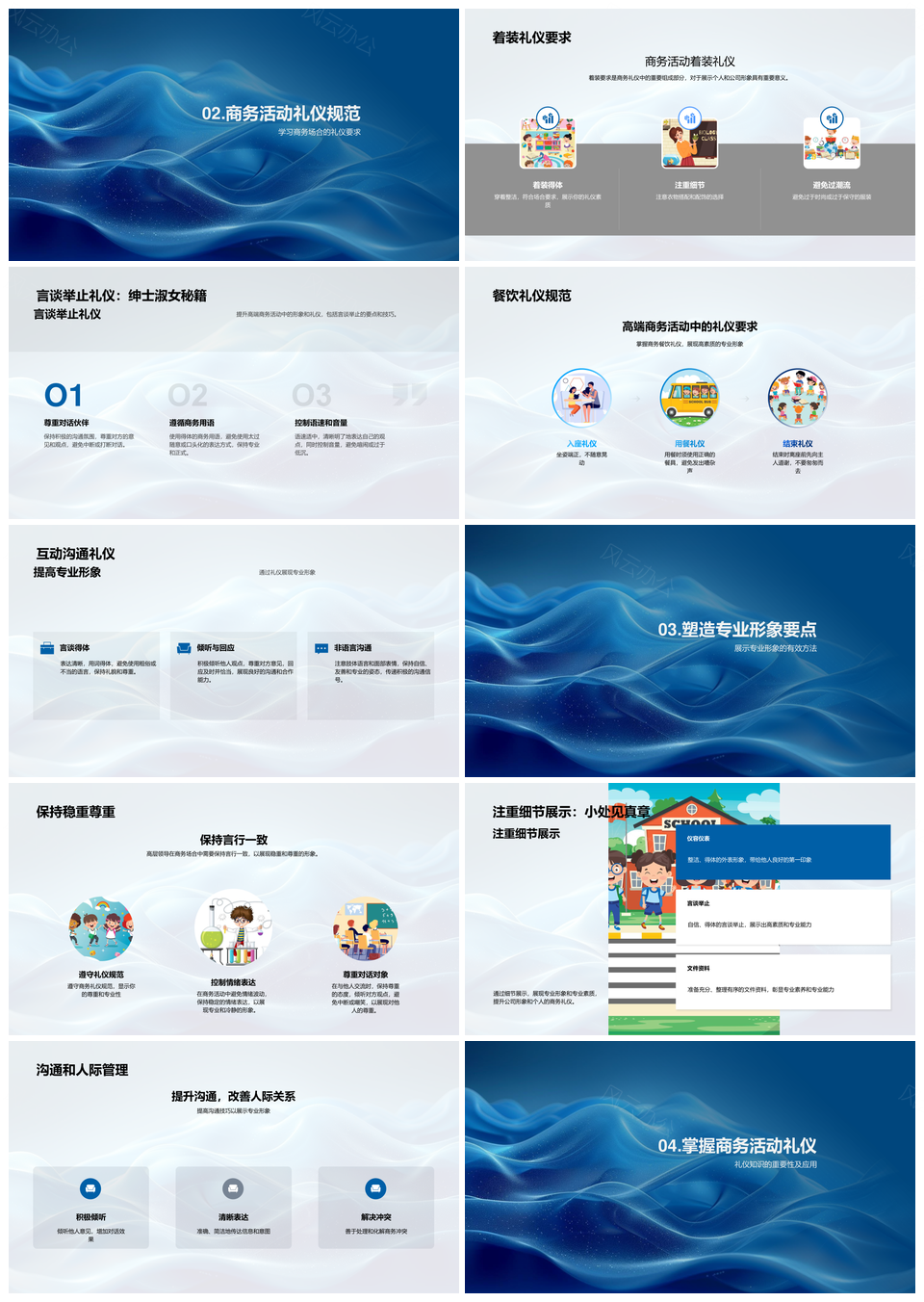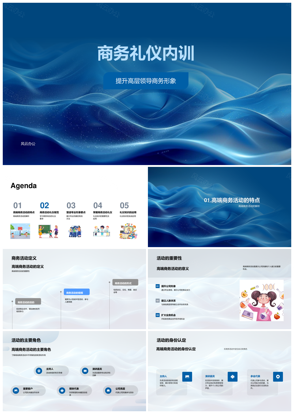 风云办公提供的高层商务礼仪与形象规范内训PPT模板,下载格式为pptx,一共25页,作品中文字及图均可以修改和编辑,图片更改请在作品中右键图片并更换,文字修改请直接点击文字进行修改。