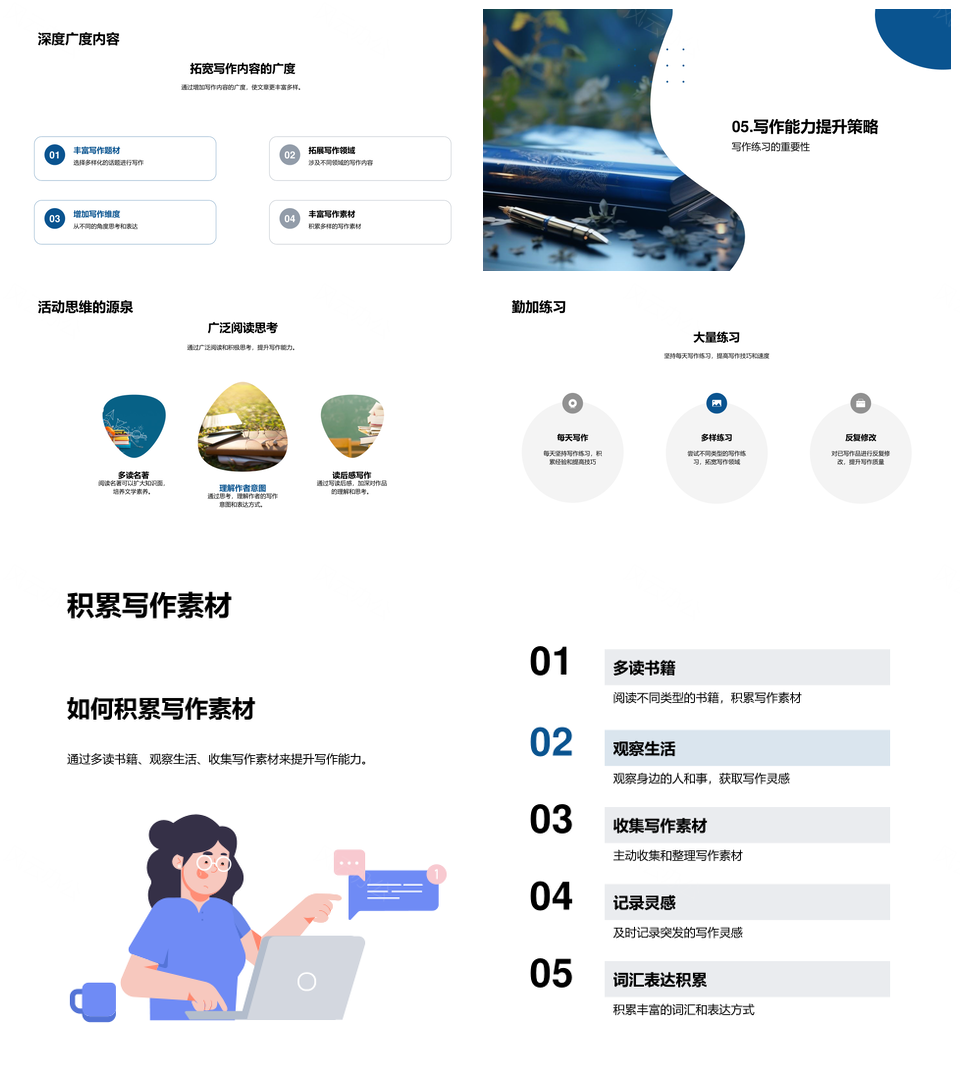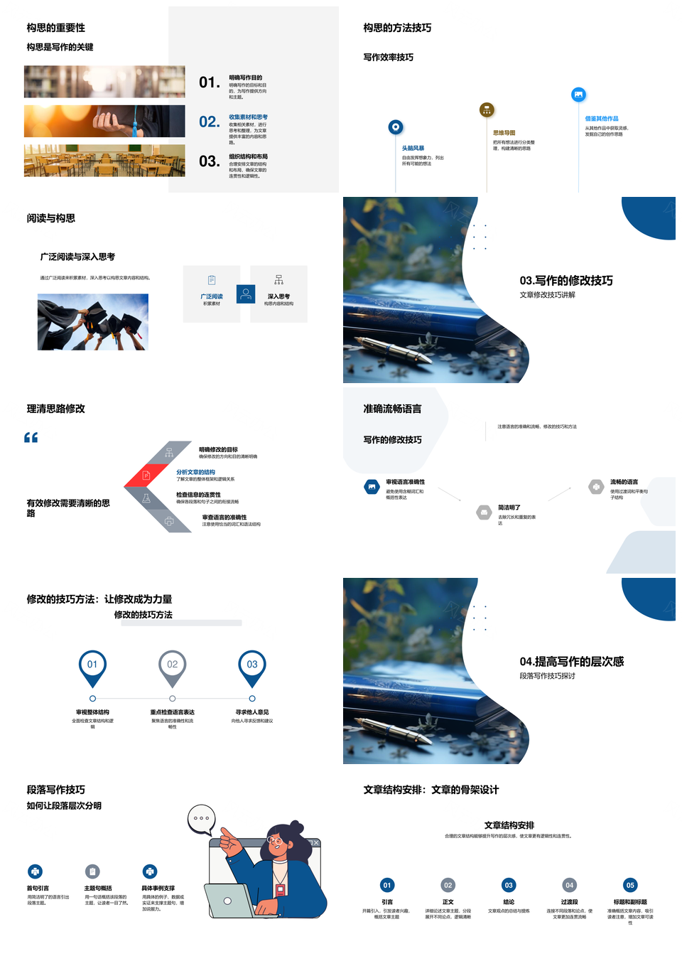 风云办公提供的初中写作理论实践提升构思修改技巧PPT模板,下载格式为pptx,一共23页,作品中文字及图均可以修改和编辑,图片更改请在作品中右键图片并更换,文字修改请直接点击文字进行修改。