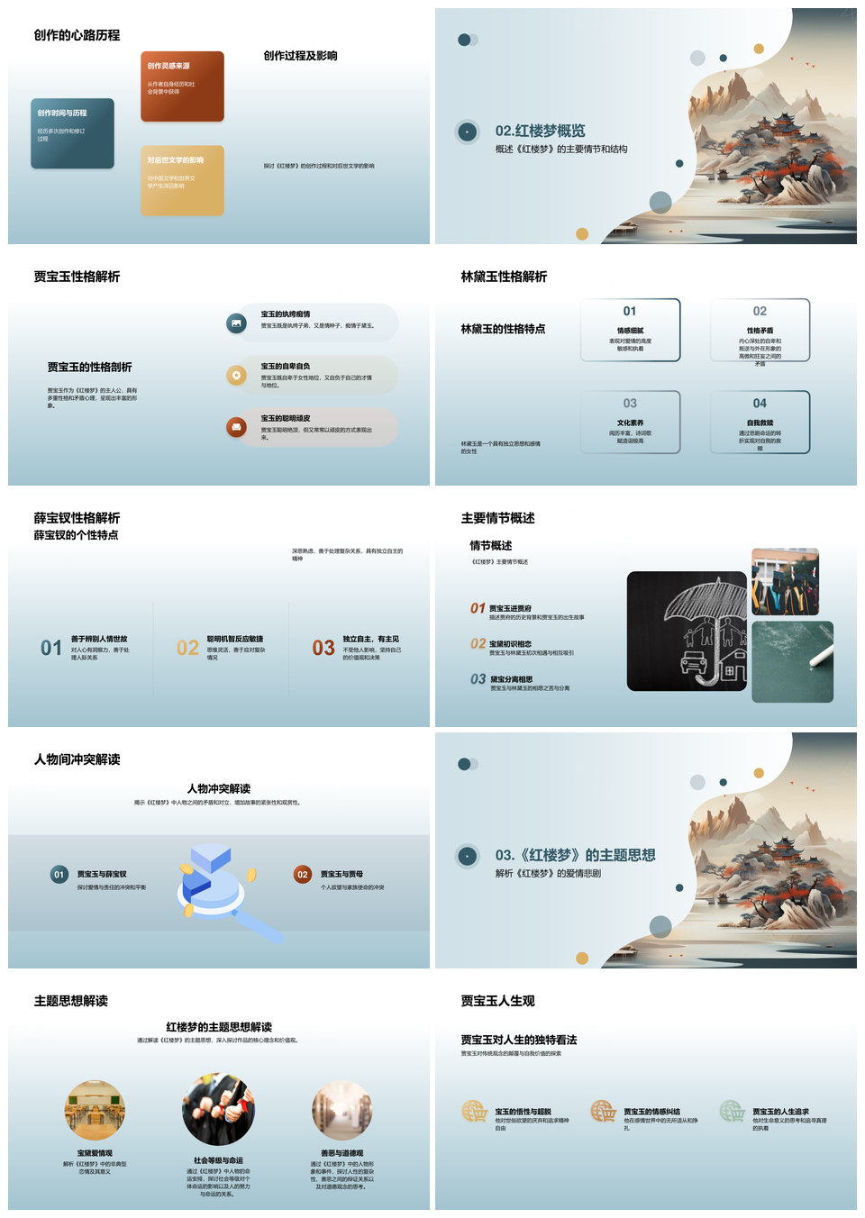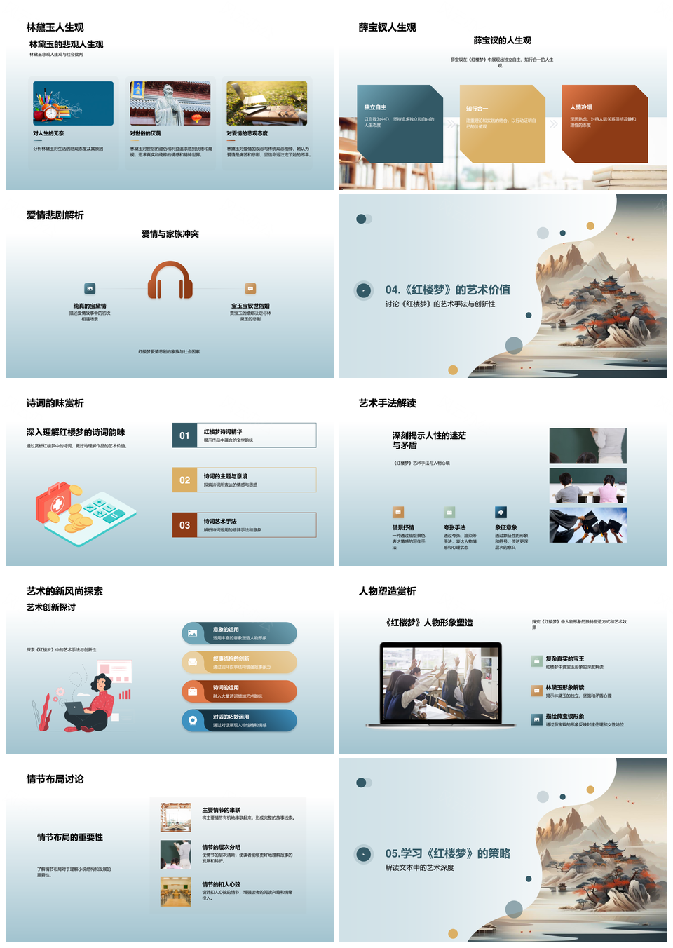 风云办公提供的红楼梦艺术创作手法背景主题人物解析PPT模板,下载格式为pptx,一共33页,作品中文字及图均可以修改和编辑,图片更改请在作品中右键图片并更换,文字修改请直接点击文字进行修改。