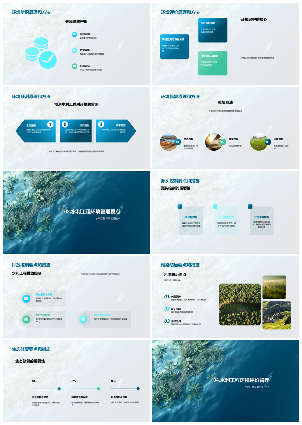 这是一张水利工程环评管理防治水土流失水质污染PPT模板,包含水利工程、环评管理、防治、水土流失、水质污染等主题内容,也可用作水利工程环评管理防治水土流失、环评管理防治水土流失水质污染、管理防治水土流失水质污染、水利工程环评管理、环评管理防治、管理防治水土流失、防治水土流失水质污染、水利工程防治水土流失、环评管理水土流失、管理水土流失水质污染、水利工程环评、环评管理、管理防治、防治水土流失、水土流失水质污染等PPT场景使用。 风云办公提供的水利工程环评管理防治水土流失水质污染PPT模板,下载格式为pptx,一共24页,作品中文字及图均可以修改和编辑,图片更改请在作品中右键图片并更换,文字修改请直接点击文字进行修改。