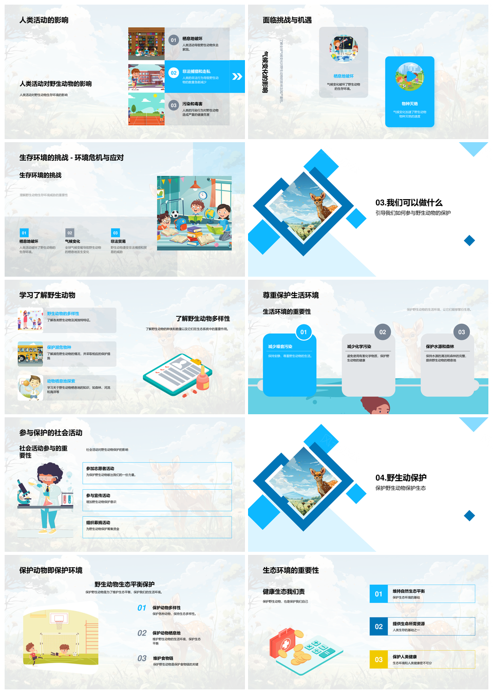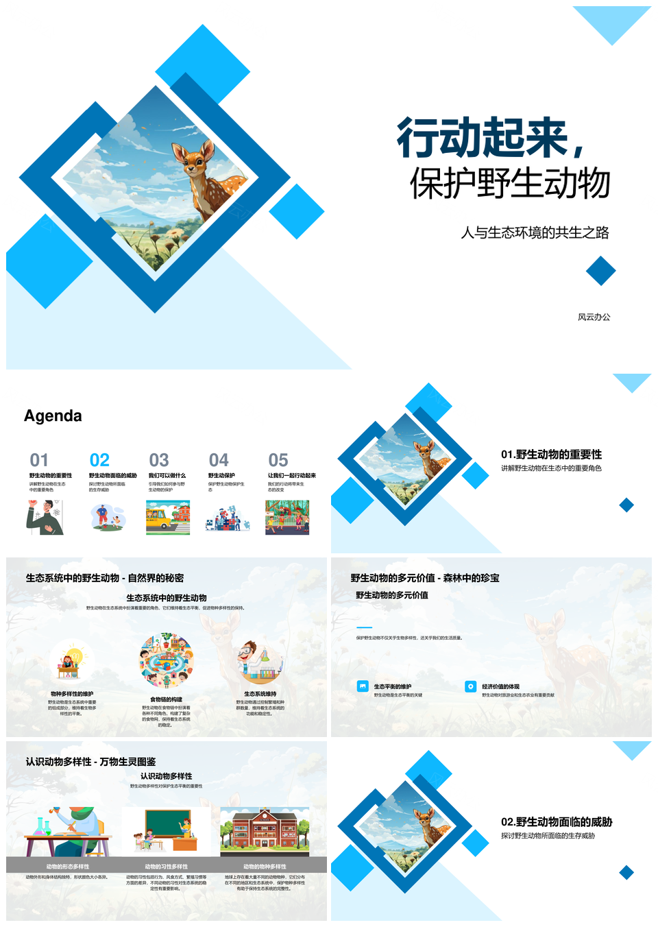 风云办公提供的守护野生动物多样维护生态平衡PPT模板,下载格式为pptx,一共23页,作品中文字及图均可以修改和编辑,图片更改请在作品中右键图片并更换,文字修改请直接点击文字进行修改。