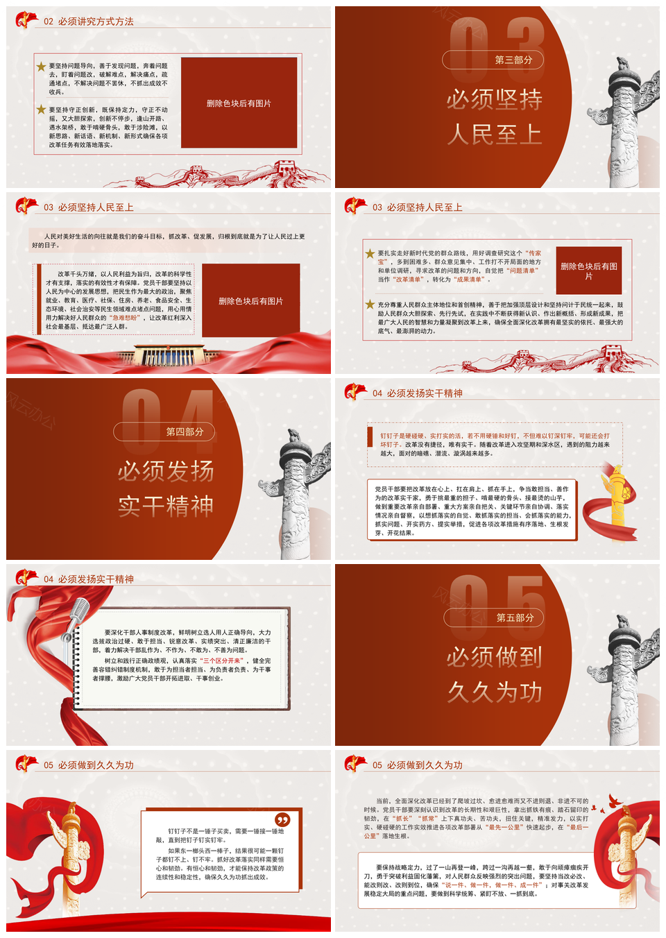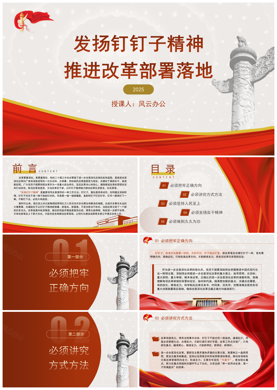 这是一张2025钉钉子精神推进改革部署落地专题党课PPT模板,包含2025、钉钉子精神、推进、改革部署、落地、专题党课等主题内容,也可用作2025钉钉子精神推进、钉钉子精神推进改革、精神推进改革部署、推进改革部署落地、改革部署落地专题、部署落地专题党课、2025钉钉子精神、钉钉子精神推进、精神推进改革、推进改革部署、改革部署落地、部署落地专题、落地专题党课、2025钉钉子、钉钉子精神等PPT场景使用。 风云办公提供的2025钉钉子精神推进改革部署落地专题党课PPT模板,下载格式为pptx,一共18页,作品中文字及图均可以修改和编辑,图片更改请在作品中右键图片并更换,文字修改请直接点击文字进行修改。