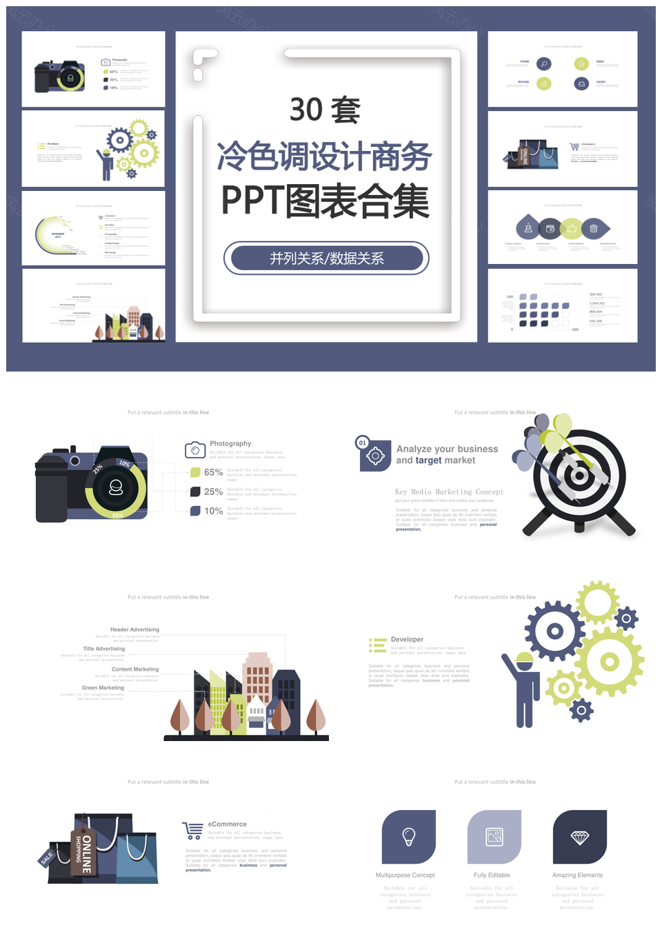 风云办公提供的冷色调设计商务并列关系数据关系PPT图表合集,下载格式为pptx,一共31页,作品中文字及图均可以修改和编辑,图片更改请在作品中右键图片并更换,文字修改请直接点击文字进行修改。