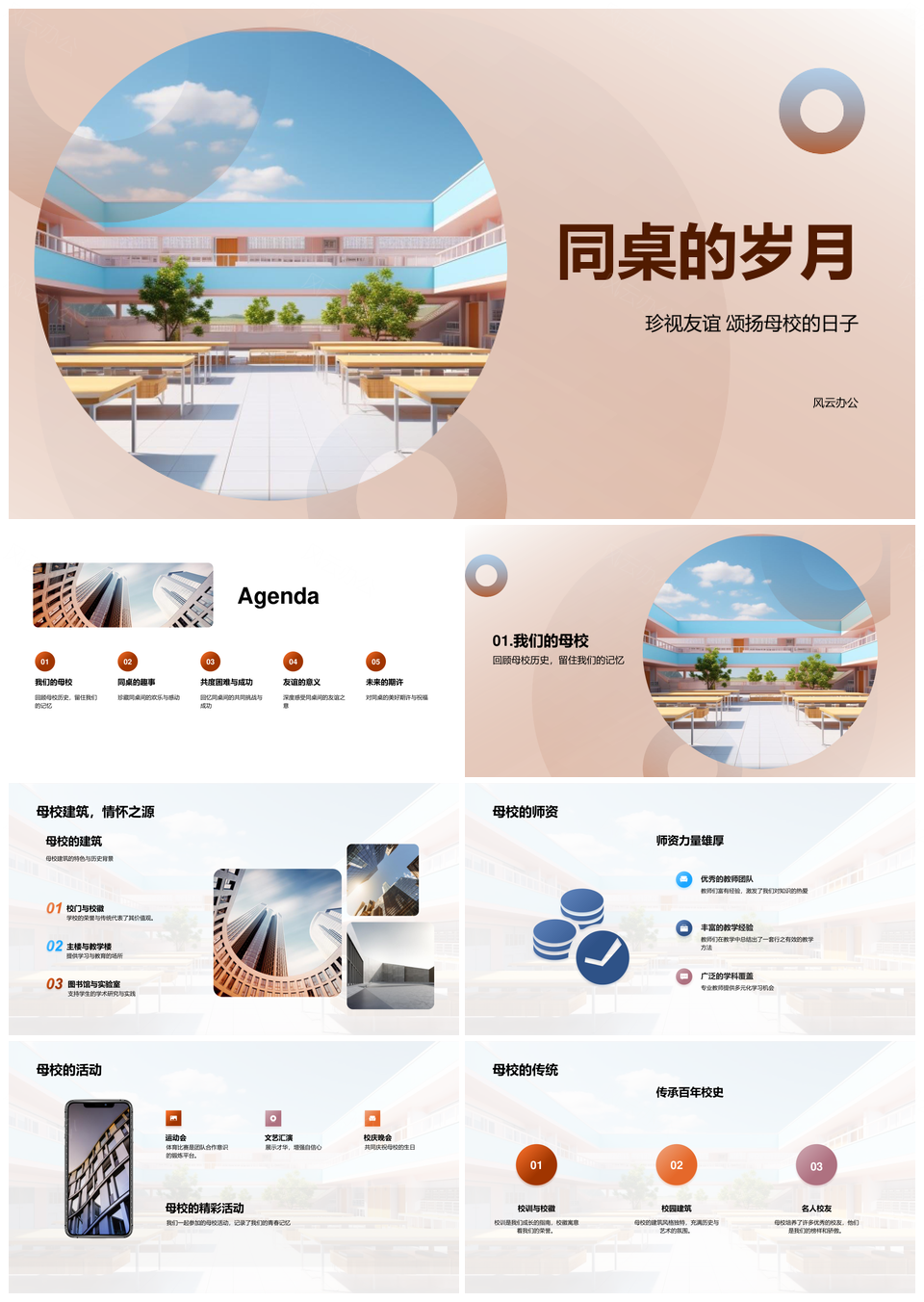 风云办公提供的母校同窗互助成长共度风雨岁月PPT模板,下载格式为pptx,一共28页,作品中文字及图均可以修改和编辑,图片更改请在作品中右键图片并更换,文字修改请直接点击文字进行修改。