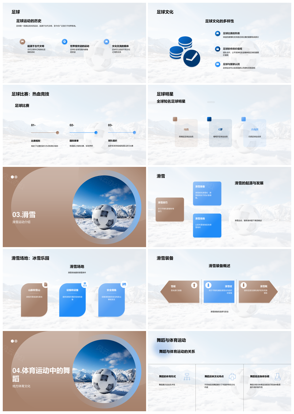 风云办公提供的全球运动地理文化学生探足球滑雪舞蹈PPT模板,下载格式为pptx,一共28页,作品中文字及图均可以修改和编辑,图片更改请在作品中右键图片并更换,文字修改请直接点击文字进行修改。