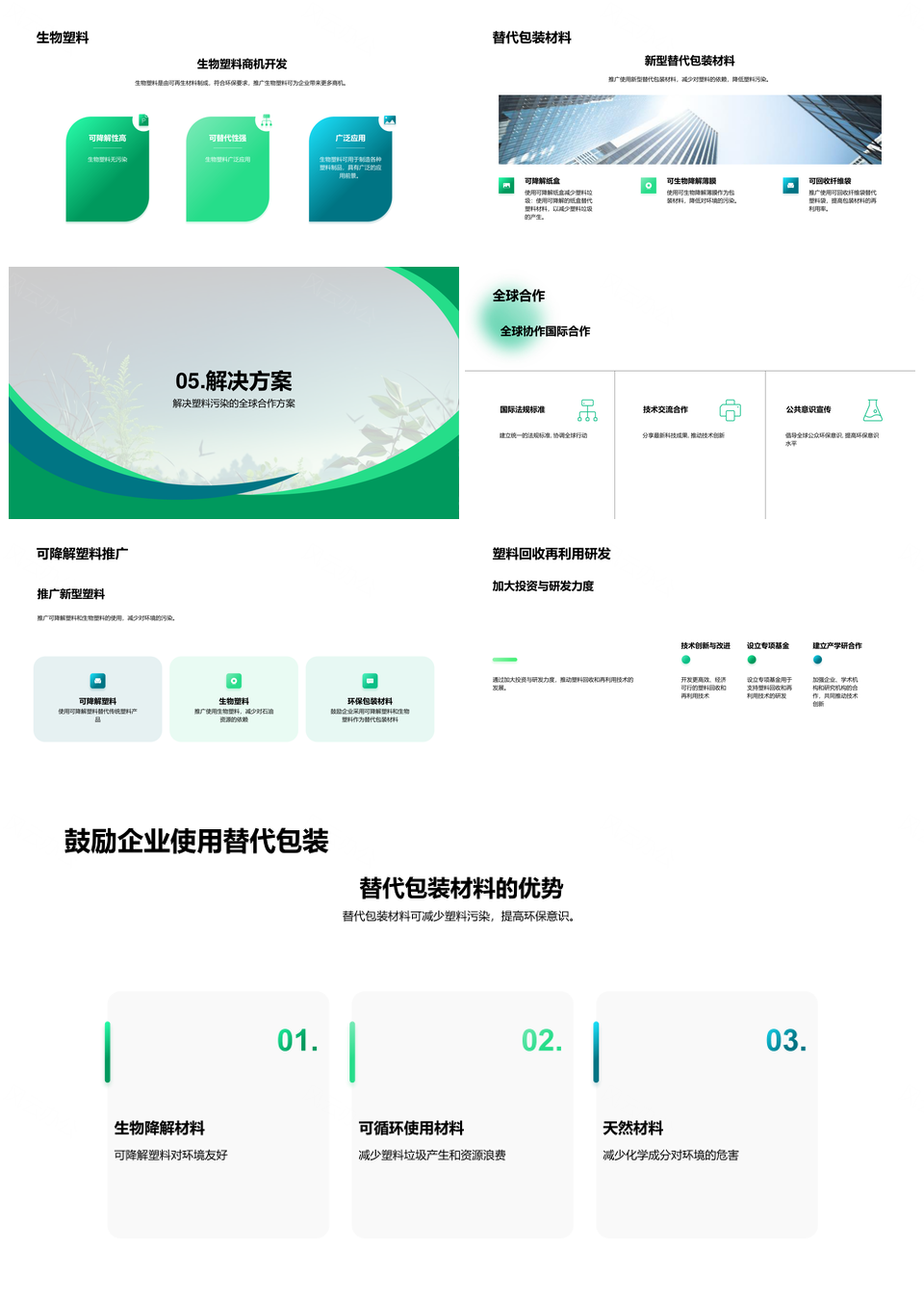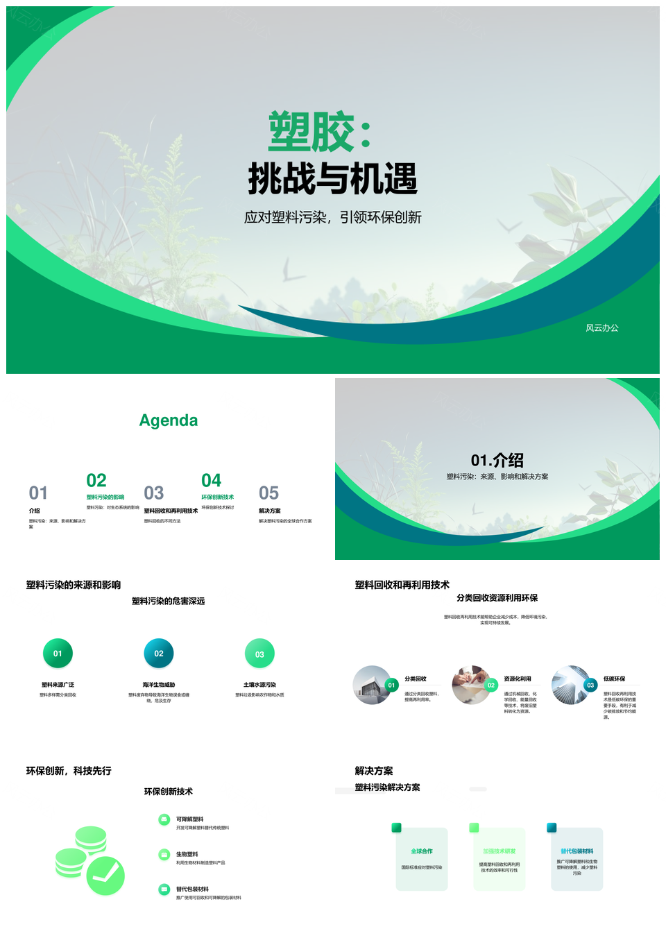 这是一张塑料污染挑战生态环保创新回收技术机遇PPT模板,包含塑料污染、挑战、生态环保、创新、回收技术、机遇等主题内容,也可用作塑料污染挑战生态环保创新、挑战生态环保创新回收技术、生态环保创新回收技术机遇、塑料污染挑战生态环保、挑战生态环保创新、生态环保创新回收技术、创新回收技术机遇、塑料污染挑战、挑战生态环保、生态环保创新、创新回收技术、回收技术机遇、塑料污染生态环保、挑战创新、生态环保回收技术等PPT场景使用。 风云办公提供的塑料污染挑战生态环保创新回收技术机遇PPT模板,下载格式为pptx,一共25页,作品中文字及图均可以修改和编辑,图片更改请在作品中右键图片并更换,文字修改请直接点击文字进行修改。