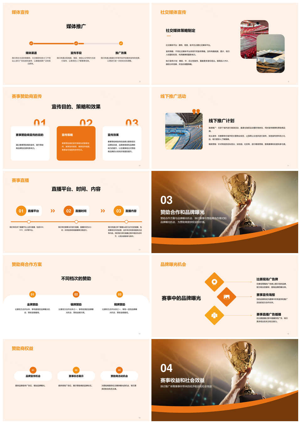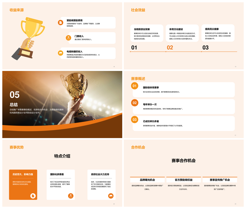 这是一张橙棕体育赛事运动获奖奖杯CTR推广计划PPT模板,包含橙棕、体育赛事、运动、获奖、奖杯、CTR、推广计划等主题内容,也可用作橙棕体育赛事运动获奖、体育赛事运动获奖奖杯、赛事运动获奖奖杯CTR、运动获奖奖杯CTR推广、获奖奖杯CTR推广计划、橙棕体育赛事运动、体育赛事运动获奖、赛事运动获奖奖杯、运动获奖奖杯CTR、获奖奖杯CTR推广、奖杯CTR推广计划、橙棕体育赛事、体育赛事运动、赛事运动获奖、获奖奖杯CTR等PPT场景使用。 风云办公提供的橙棕体育赛事运动获奖奖杯CTR推广计划PPT模板,下载格式为pptx,一共24页,作品中文字及图均可以修改和编辑,图片更改请在作品中右键图片并更换,文字修改请直接点击文字进行修改。
