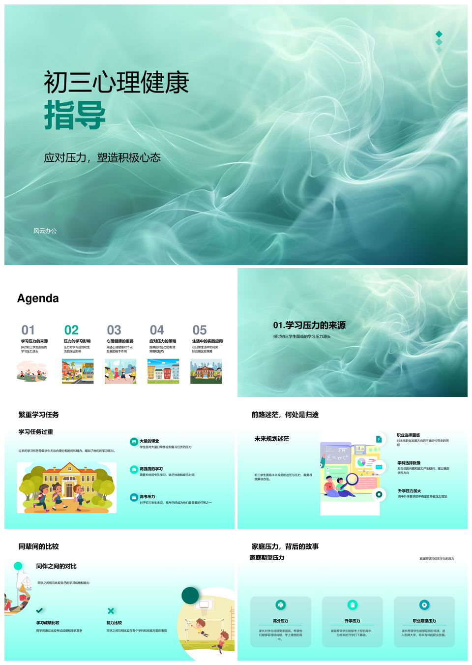 风云办公提供的初三心理健康压力应对与心态调整指导PPT模板,下载格式为pptx,一共33页,作品中文字及图均可以修改和编辑,图片更改请在作品中右键图片并更换,文字修改请直接点击文字进行修改。