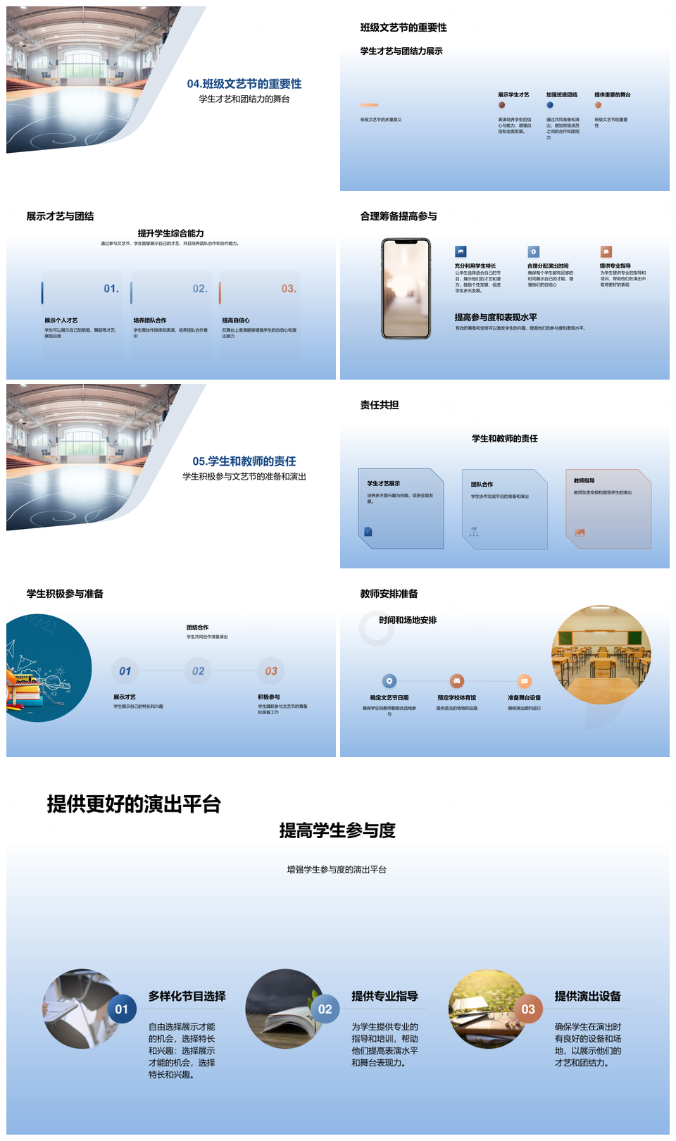 这是一张四年级班级文艺节才艺舞歌团结体育馆筹备PPT模板,包含四年级、班级、文艺节、才艺、舞歌、团结、体育馆、筹备等主题内容,也可用作四年级班级文艺节才艺、班级文艺节才艺舞歌、文艺节才艺舞歌团结、才艺舞歌团结体育馆、舞歌团结体育馆筹备、四年级班级才艺舞歌、班级才艺舞歌团结、才艺舞歌体育馆筹备、四年级文艺节才艺舞歌、文艺节才艺体育馆筹备、四年级班级体育馆筹备、班级团结体育馆筹备、四年级才艺舞歌团结、班级舞歌团结体育馆、才艺团结体育馆筹备等PPT场景使用。 风云办公提供的四年级班级文艺节才艺舞歌团结体育馆筹备PPT模板,下载格式为pptx,一共27页,作品中文字及图均可以修改和编辑,图片更改请在作品中右键图片并更换,文字修改请直接点击文字进行修改。