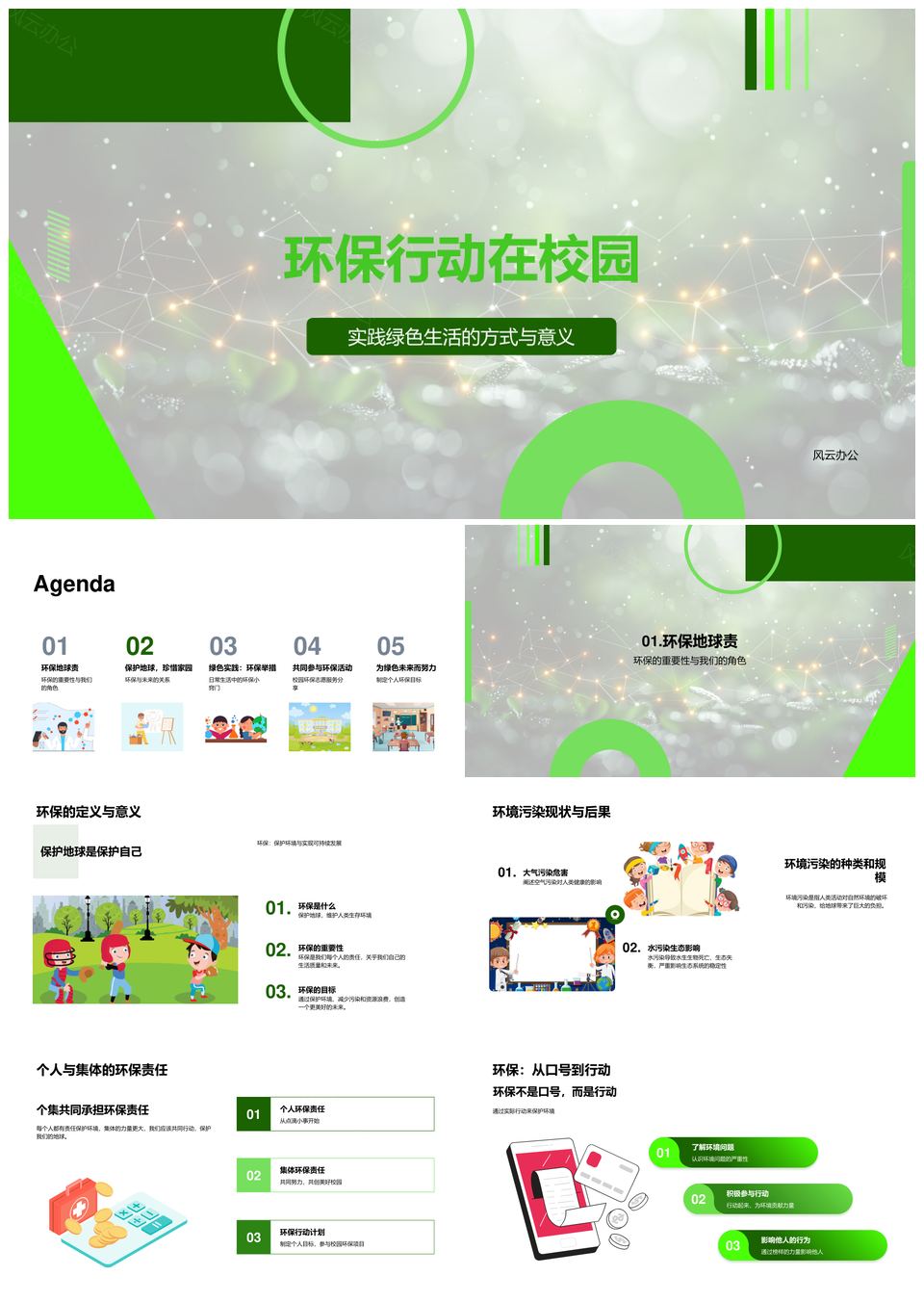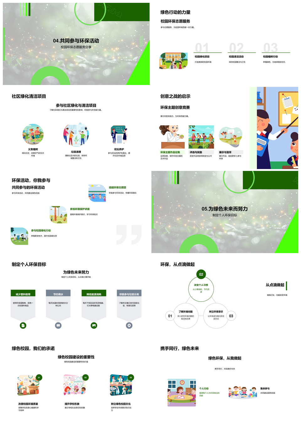 这是一张校园环保绿色教育创意竞赛节能节水分类志愿行动PPT模板,包含校园、环保、绿色教育、创意竞赛、节能、节水、分类、志愿行动等主题内容,也可用作校园环保绿色教育、绿色教育创意竞赛、创意竞赛节能节水、节能节水分类志愿、分类志愿行动、校园环保创意、绿色教育节能、节水分类志愿、创意竞赛节能、节能节水行动、教育创意竞赛、环保绿色教育、竞赛节能节水、校园环保、绿色教育等PPT场景使用。 风云办公提供的校园环保绿色教育创意竞赛节能节水分类志愿行动PPT模板,下载格式为pptx,一共28页,作品中文字及图均可以修改和编辑,图片更改请在作品中右键图片并更换,文字修改请直接点击文字进行修改。