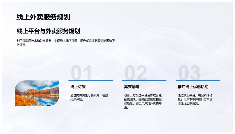 这是一张餐饮业疫情转型策略风险应对消费变化行业格局市场机遇创新服务政策PPT模板,包含餐饮业、疫情、转型策略、风险、应对、消费、变化、行业格局、市场机遇、创新服务、政策等主题内容,也可用作餐饮业疫情转型策略风险应对、餐饮业疫情转型策略、疫情转型策略风险应对、风险应对消费变化行业格局、消费变化行业格局市场机遇、行业格局市场机遇创新服务、市场机遇创新服务政策、餐饮业疫情转型、疫情转型策略、转型策略风险应对、消费变化行业格局、行业格局市场机遇、市场机遇创新服务、创新服务政策、风险应对消费变化等PPT场景使用。 风云办公提供的餐饮业疫情转型策略风险应对消费变化行业格局市场机遇创新服务政策PPT模板,下载格式为pptx,一共29页,作品中文字及图均可以修改和编辑,图片更改请在作品中右键图片并更换,文字修改请直接点击文字进行修改。