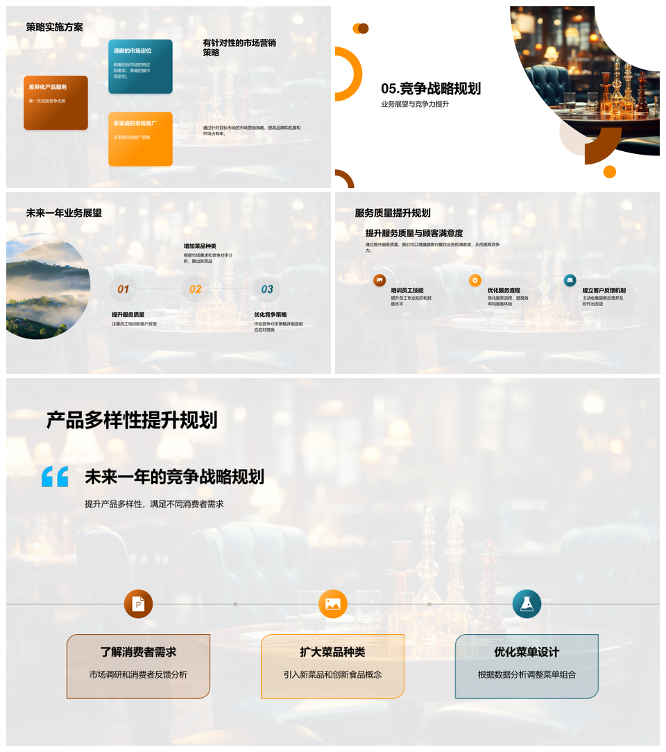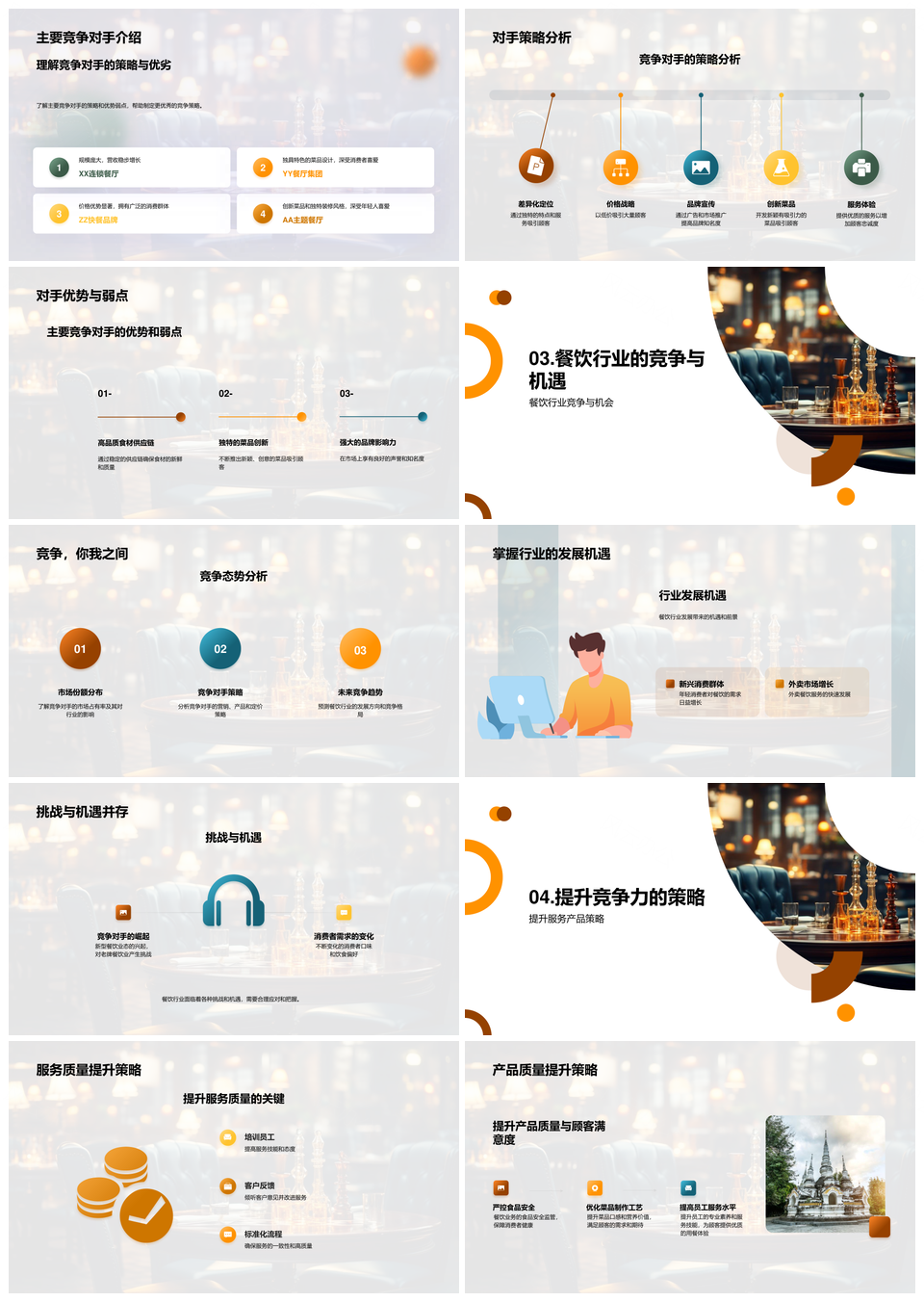 这是一张餐饮业竞争策略对手分析服务品质与桌设优化PPT模板,包含餐饮业、竞争策略、对手分析、服务品质、桌设优化等主题内容,也可用作餐饮业竞争策略分析、竞争策略对手分析、服务品质桌设优化、桌设优化服务品质、餐饮业服务品质优化、餐饮业桌设优化策略、竞争对手分析、服务品质优化、桌设优化策略、餐饮业服务品质、餐饮业桌设优化、策略分析优化、竞争策略、服务品质、桌设优化等PPT场景使用。 风云办公提供的餐饮业竞争策略对手分析服务品质与桌设优化PPT模板,下载格式为pptx,一共23页,作品中文字及图均可以修改和编辑,图片更改请在作品中右键图片并更换,文字修改请直接点击文字进行修改。