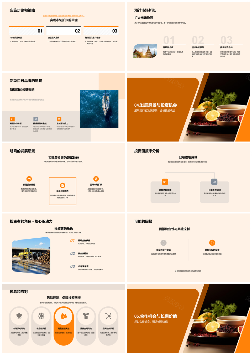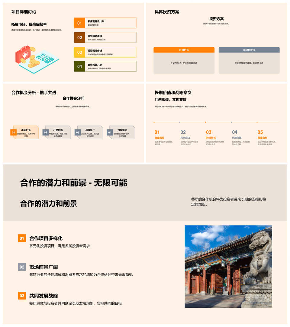 这是一张品牌美食餐饮业合作发展机遇投资策略发布会PPT模板,包含品牌、美食、餐饮业、合作、发展、机遇、投资、策略、发布会等主题内容,也可用作品牌美食餐饮业合作、美食餐饮业合作发展、餐饮业合作发展机遇、合作发展机遇投资、发展机遇投资策略、机遇投资策略发布会、品牌美食餐饮业、美食餐饮业合作、餐饮业合作发展、合作发展机遇、发展机遇投资、机遇投资策略、投资策略发布会、品牌美食、美食餐饮业等PPT场景使用。 风云办公提供的品牌美食餐饮业合作发展机遇投资策略发布会PPT模板,下载格式为pptx,一共33页,作品中文字及图均可以修改和编辑,图片更改请在作品中右键图片并更换,文字修改请直接点击文字进行修改。