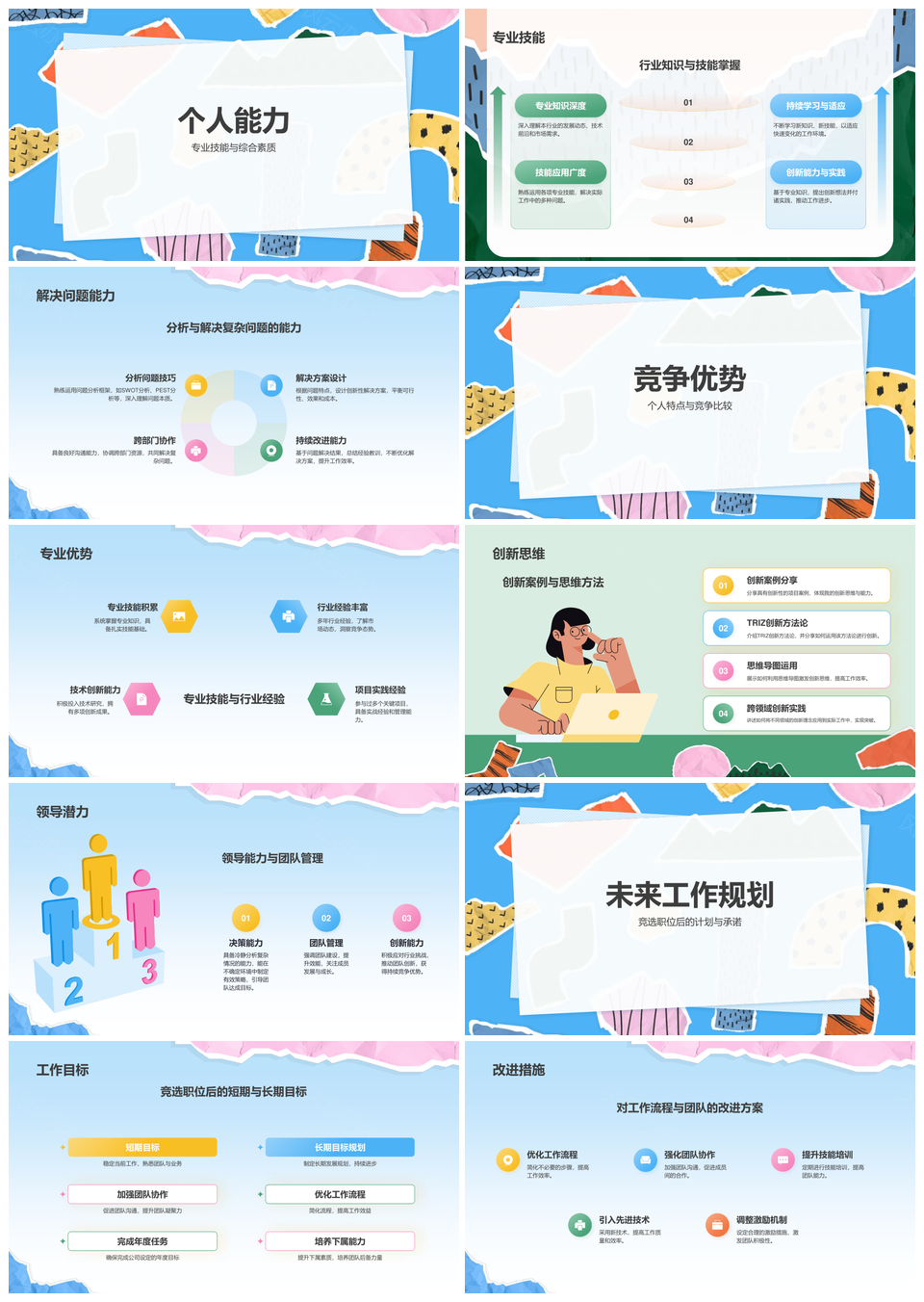 这是一张蓝色扁平风竞聘述职工作业绩能力优势未来规划报告PPT模板,包含蓝色、扁平风、竞聘、述职、工作、业绩、能力、优势、未来、规划、报告等主题内容,也可用作蓝色扁平风竞聘述职、扁平风竞聘述职工作、竞聘述职工作业绩、述职工作业绩能力、工作业绩能力优势、业绩能力优势未来、能力优势未来规划、优势未来规划报告、蓝色扁平风竞聘、扁平风竞聘述职、竞聘述职工作、述职工作业绩、工作业绩能力、业绩能力优势、能力优势未来等PPT场景使用。 风云办公提供的蓝色扁平风竞聘述职工作业绩能力优势未来规划报告PPT模板,下载格式为pptx,一共18页,作品中文字及图均可以修改和编辑,图片更改请在作品中右键图片并更换,文字修改请直接点击文字进行修改。