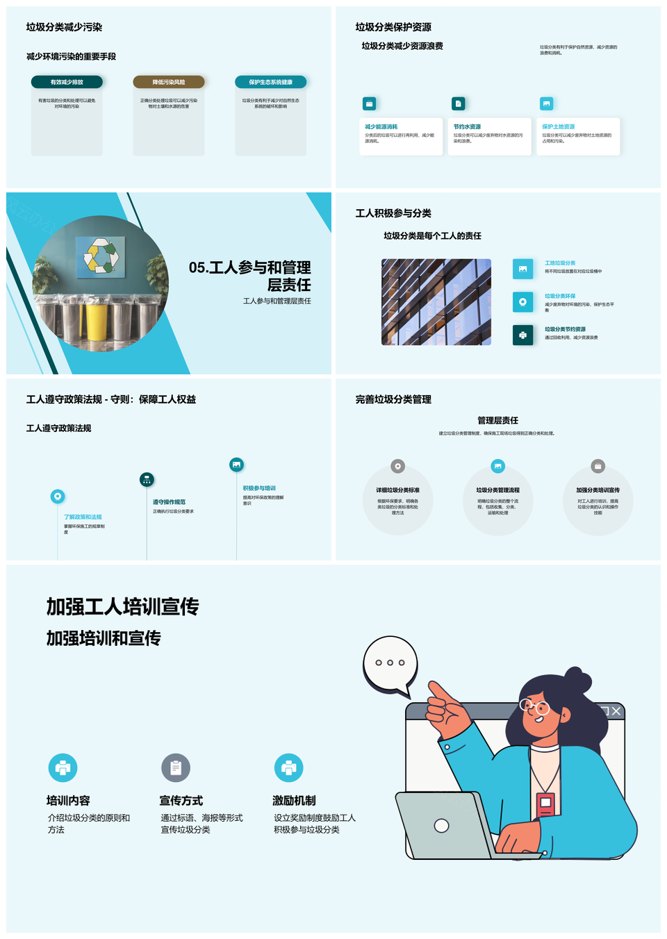这是一张环保施工现场垃圾分类指南指导绿色建筑PPT模板,包含环保施工现场、垃圾分类指南、指导、绿色建筑等主题内容,也可用作环保施工现场垃圾分类指南、施工现场垃圾分类指南指导、垃圾分类指南指导绿色建筑、环保施工现场垃圾分类、施工现场垃圾分类指南、垃圾分类指南指导、指南指导绿色建筑、环保指南指导绿色建筑、环保施工现场、施工现场垃圾分类、垃圾分类指南、指南指导、指导绿色建筑、环保绿色建筑、垃圾分类绿色建筑等PPT场景使用。 风云办公提供的环保施工现场垃圾分类指南指导绿色建筑PPT模板,下载格式为pptx,一共25页,作品中文字及图均可以修改和编辑,图片更改请在作品中右键图片并更换,文字修改请直接点击文字进行修改。