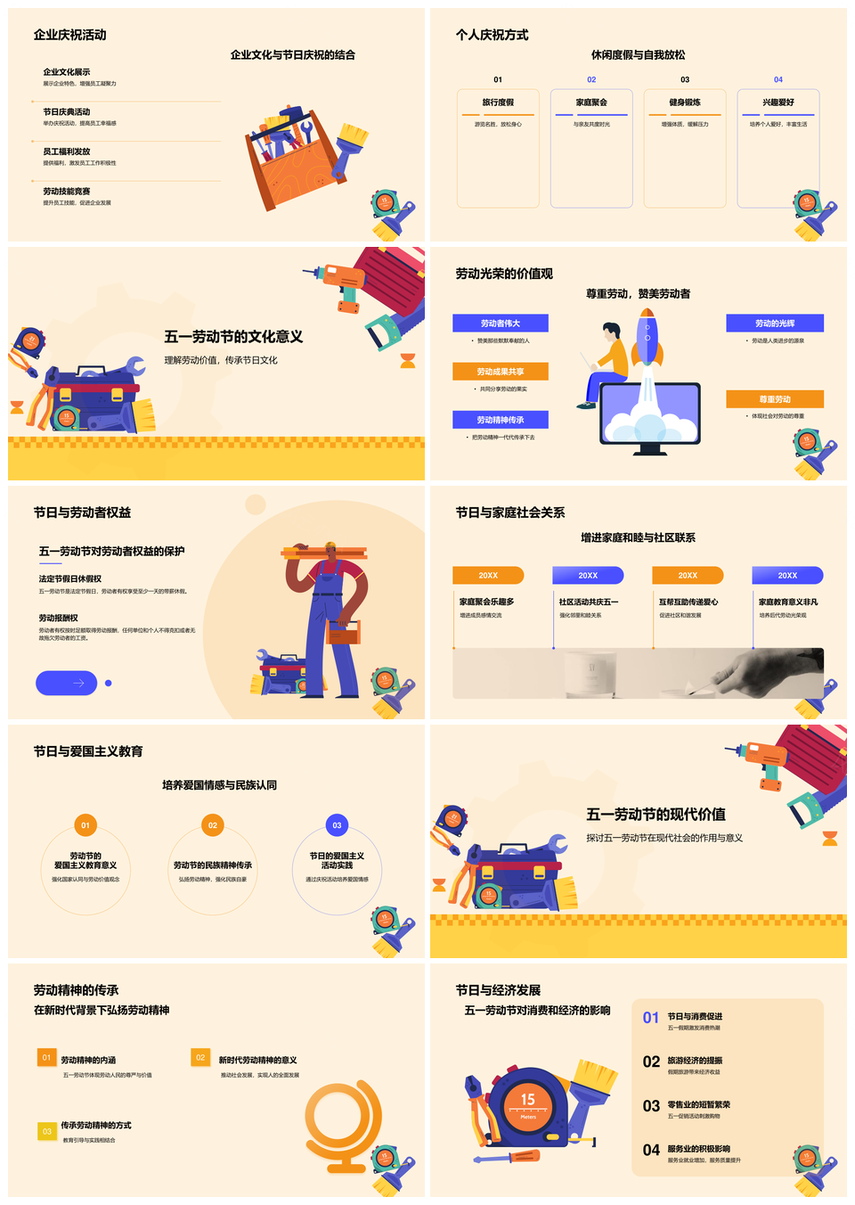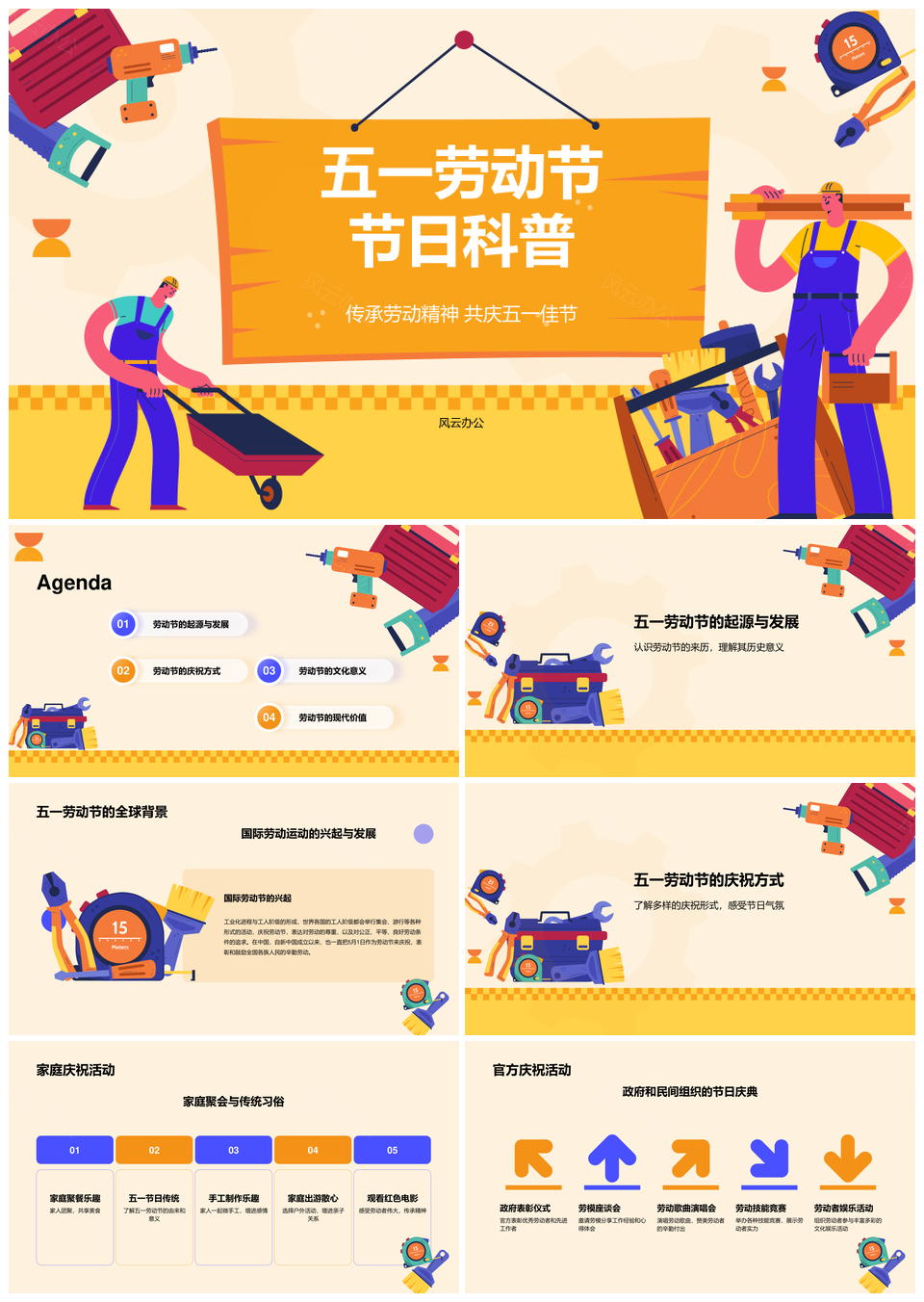 这是一张五一劳动节历史庆祝文化教育国家价值尊重劳动PPT模板,包含五一劳动节、历史、庆祝、文化、教育、国家、价值、尊重、劳动等主题内容,也可用作五一劳动节历史庆祝文化教育、五一劳动节庆祝文化教育国家、历史庆祝文化教育国家、庆祝文化教育国家价值、文化教育国家价值尊重、教育国家价值尊重劳动、五一劳动节历史庆祝文化、五一劳动节历史庆祝国家、历史庆祝文化教育价值、庆祝文化教育国家尊重、文化教育国家尊重劳动、五一劳动节教育国家、历史庆祝国家价值、文化教育尊重劳动、国家价值尊重劳动等PPT场景使用。 风云办公提供的五一劳动节历史庆祝文化教育国家价值尊重劳动PPT模板,下载格式为pptx,一共20页,作品中文字及图均可以修改和编辑,图片更改请在作品中右键图片并更换,文字修改请直接点击文字进行修改。