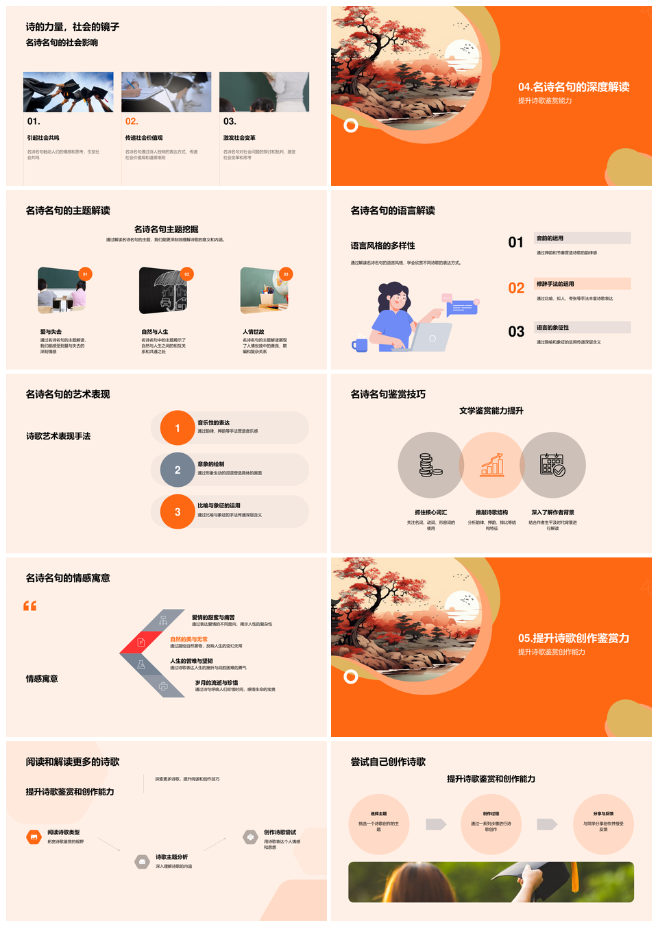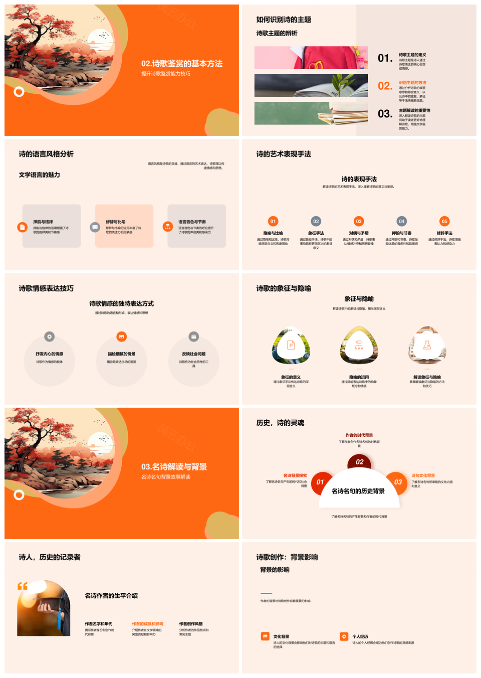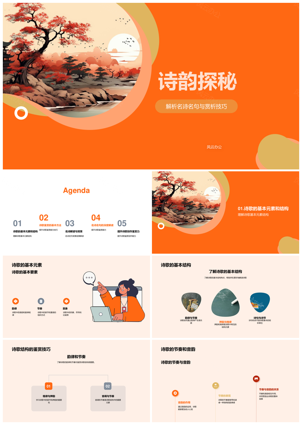 风云办公提供的诗韵名句赏鉴技巧诗构元素古卷探秘PPT模板,下载格式为pptx,一共30页,作品中文字及图均可以修改和编辑,图片更改请在作品中右键图片并更换,文字修改请直接点击文字进行修改。