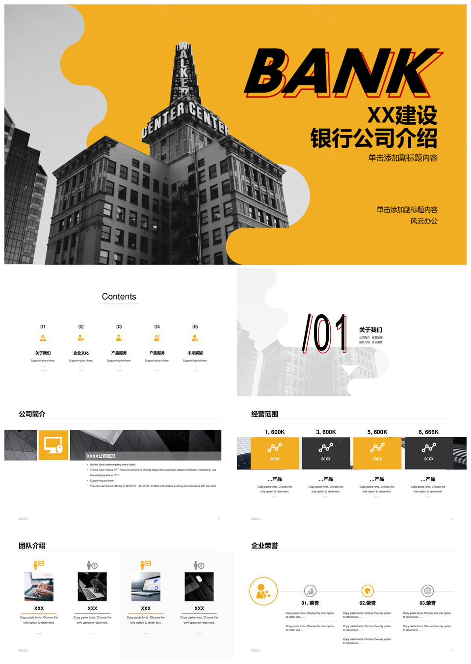 风云办公提供的建设银行公司简介商务PPT案例,下载格式为pptx,一共23页,作品中文字及图均可以修改和编辑,图片更改请在作品中右键图片并更换,文字修改请直接点击文字进行修改。