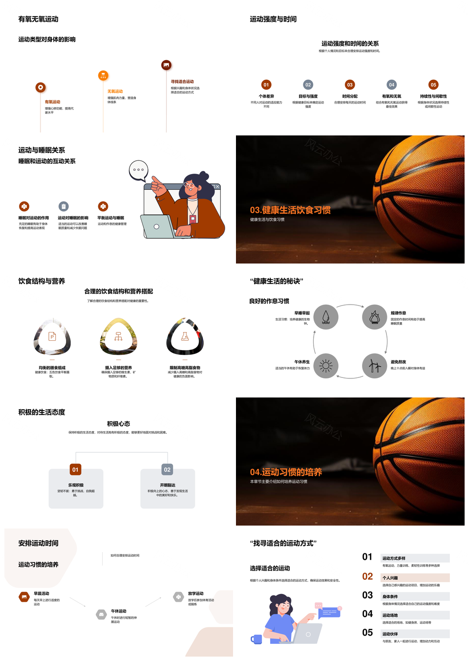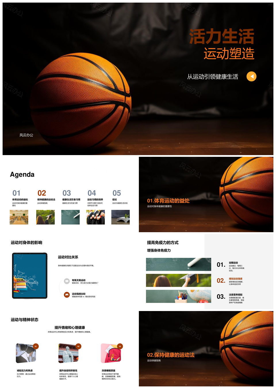 风云办公提供的活力运动强免疫有氧篮球健康生活睡眠PPT模板,下载格式为pptx,一共23页,作品中文字及图均可以修改和编辑,图片更改请在作品中右键图片并更换,文字修改请直接点击文字进行修改。