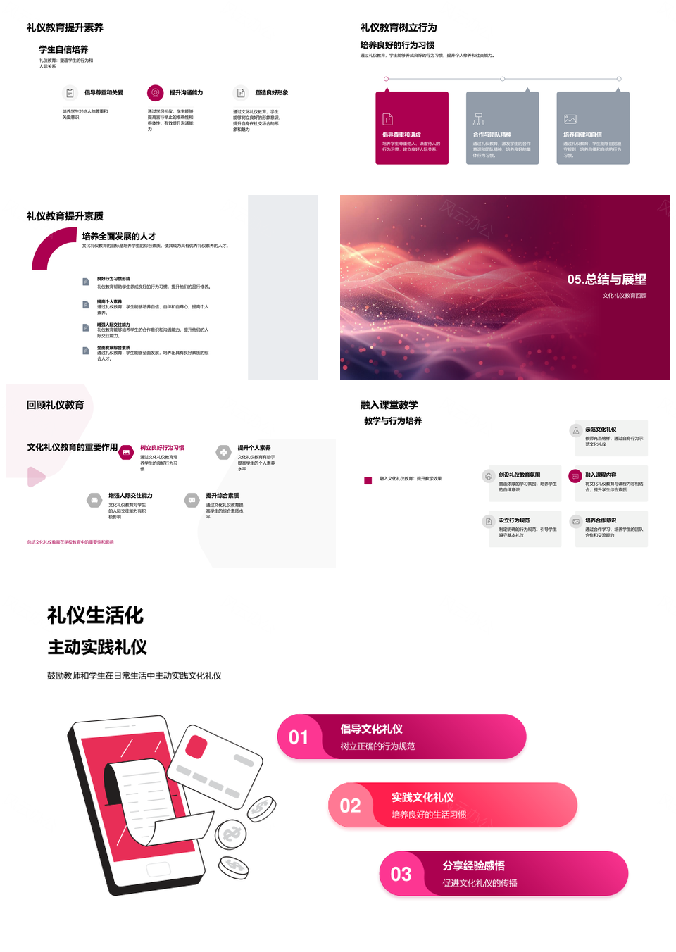 这是一张文化礼仪教育提升素养校园教学应用PPT模板,包含文化、礼仪、教育、提升、素养、校园、教学、应用等主题内容,也可用作文化礼仪教育提升、礼仪教育提升素养、教育提升素养校园、提升素养校园教学、素养校园教学应用、文化礼仪教育、礼仪教育提升、教育提升素养、提升素养校园、素养校园教学、校园教学应用、文化礼仪、礼仪教育、教育提升、提升素养等PPT场景使用。