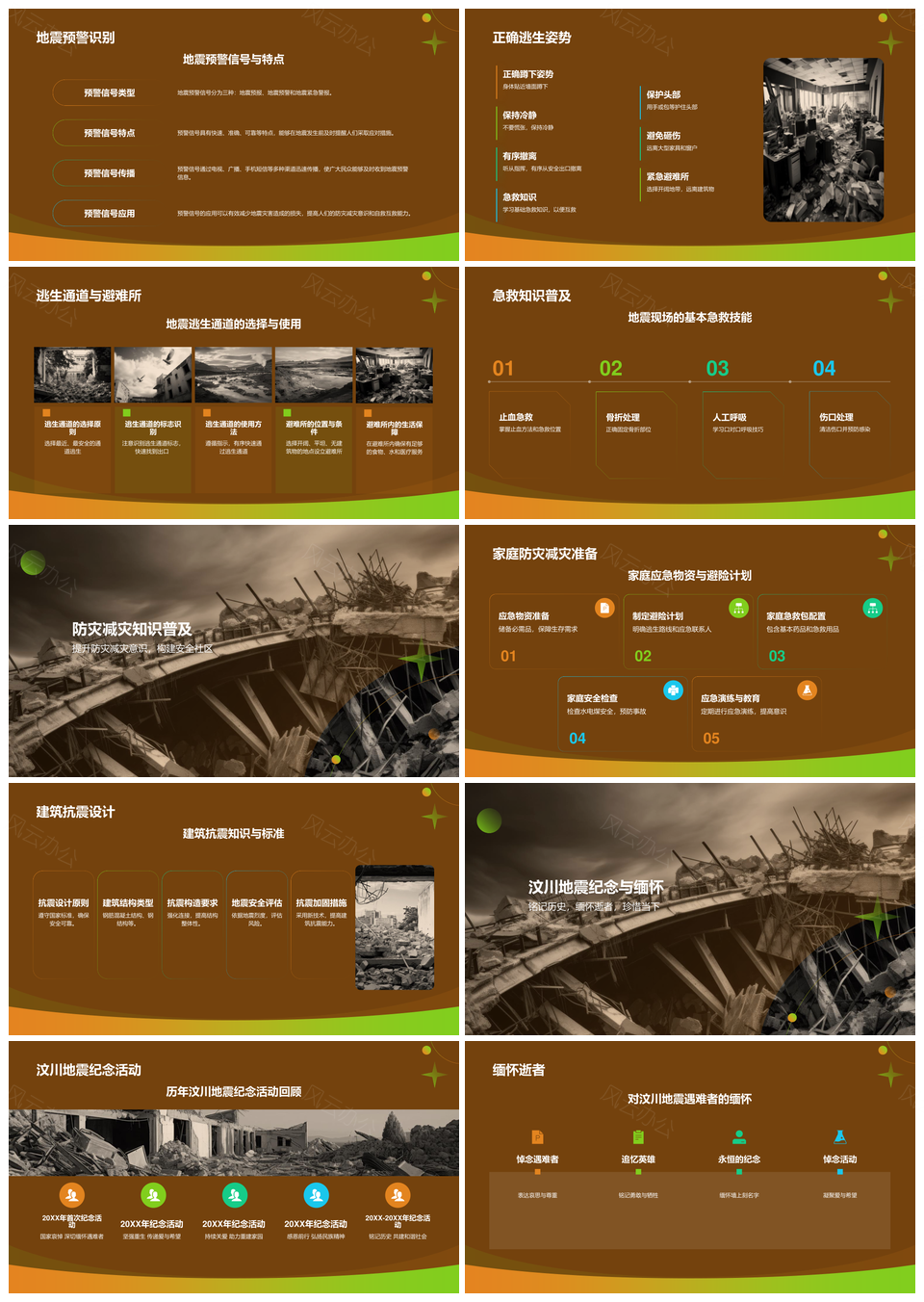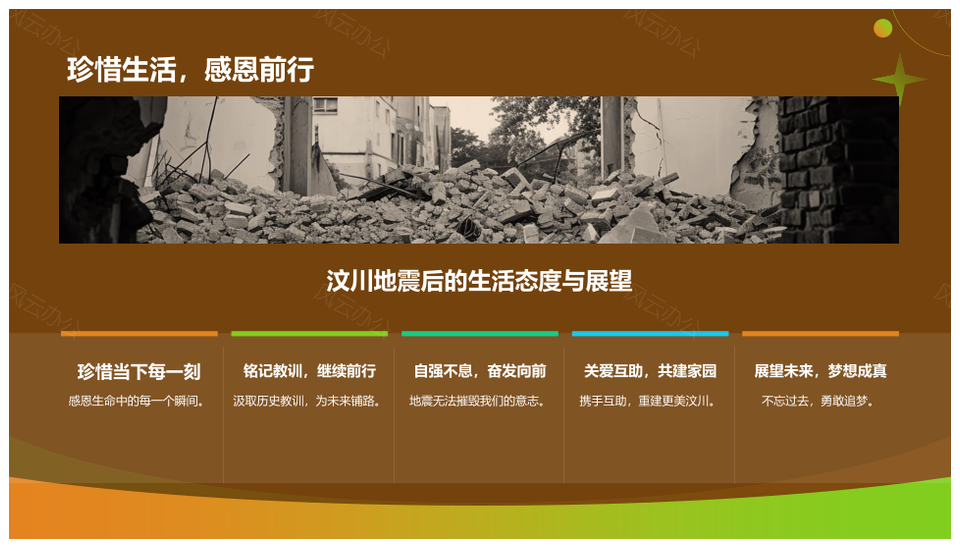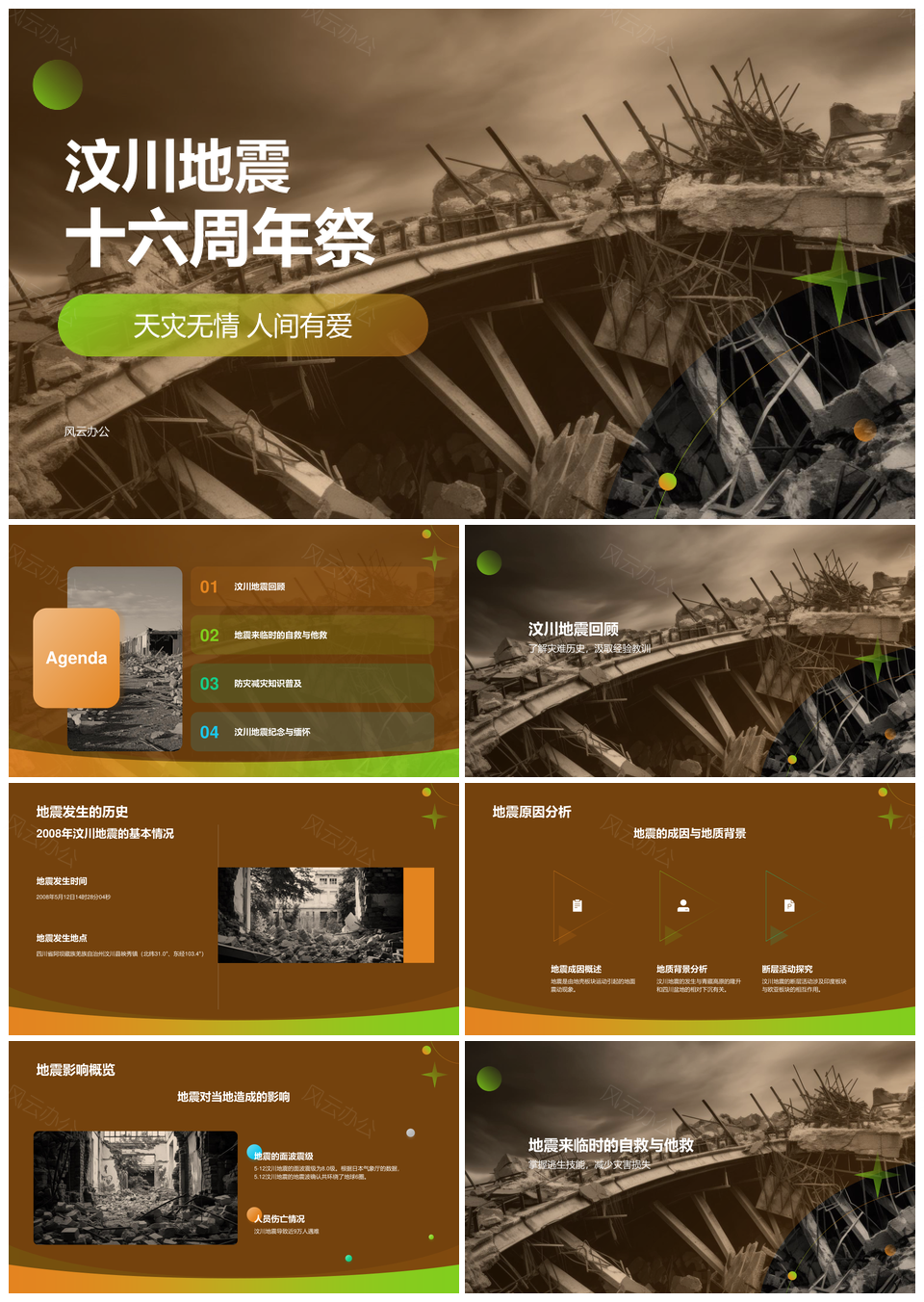 这是一张汶川地震十六年安全教育课件自救重生精神传承PPT模板,包含汶川地震、十六年、安全教育、课件、自救、重生、精神、传承等主题内容,也可用作汶川地震十六年安全教育课件、十六年安全教育课件自救、安全教育课件自救重生、课件自救重生精神传承、自救重生精神传承汶川、汶川地震自救重生精神、地震自救重生精神传承、汶川地震十六年自救、十六年安全教育精神传承、安全教育精神传承重生、课件精神传承十六年、汶川地震课件自救、重生精神传承课件、十六年安全自救重生、自救重生十六年传承等PPT场景使用。 风云办公提供的汶川地震十六年安全教育课件自救重生精神传承PPT模板,下载格式为pptx,一共19页,作品中文字及图均可以修改和编辑,图片更改请在作品中右键图片并更换,文字修改请直接点击文字进行修改。