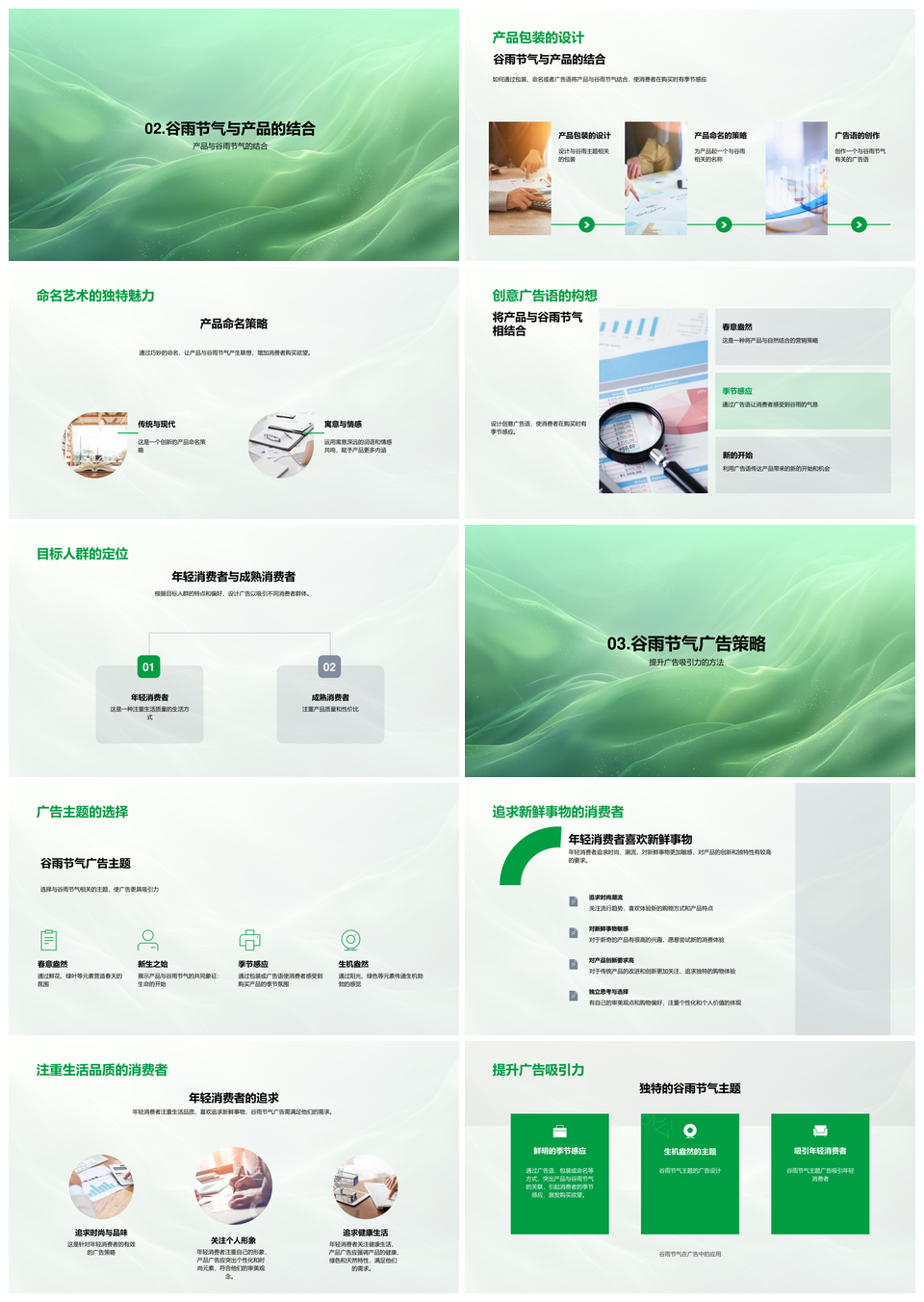这是一张谷雨节广告设计产品营销活动策划包装实施PPT模板,包含谷雨节、广告设计、产品、营销活动、策划、包装、实施等主题内容,也可用作谷雨节广告设计产品营销活动策划、广告设计产品营销活动策划包装实施、谷雨节广告设计产品营销、广告设计产品营销活动策划、产品营销活动策划包装实施、谷雨节广告设计活动策划、广告设计活动策划包装实施、谷雨节广告设计包装实施、谷雨节广告设计、广告设计产品营销、产品营销活动策划、活动策划包装实施、谷雨节活动策划、广告设计活动策划、产品营销包装实施等PPT场景使用。 风云办公提供的谷雨节广告设计产品营销活动策划包装实施PPT模板,下载格式为pptx,一共28页,作品中文字及图均可以修改和编辑,图片更改请在作品中右键图片并更换,文字修改请直接点击文字进行修改。