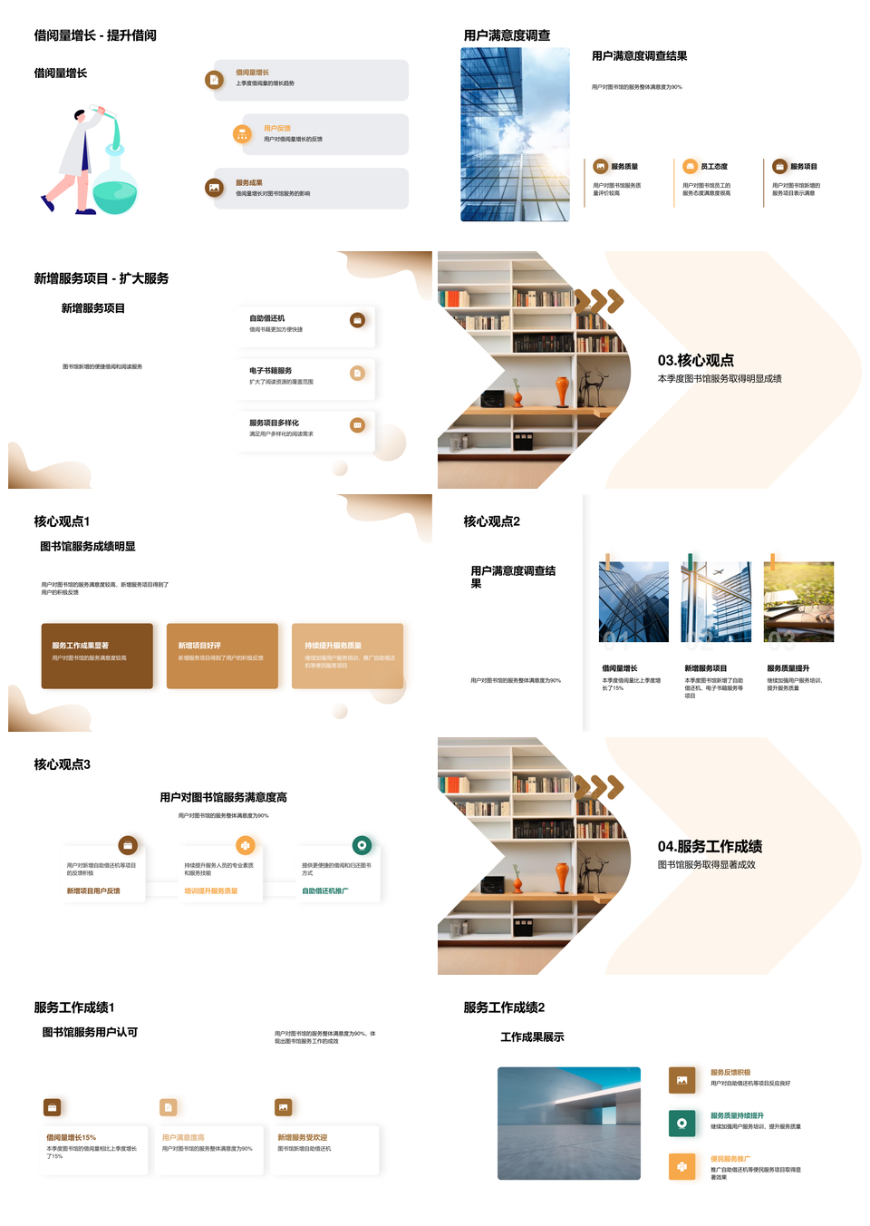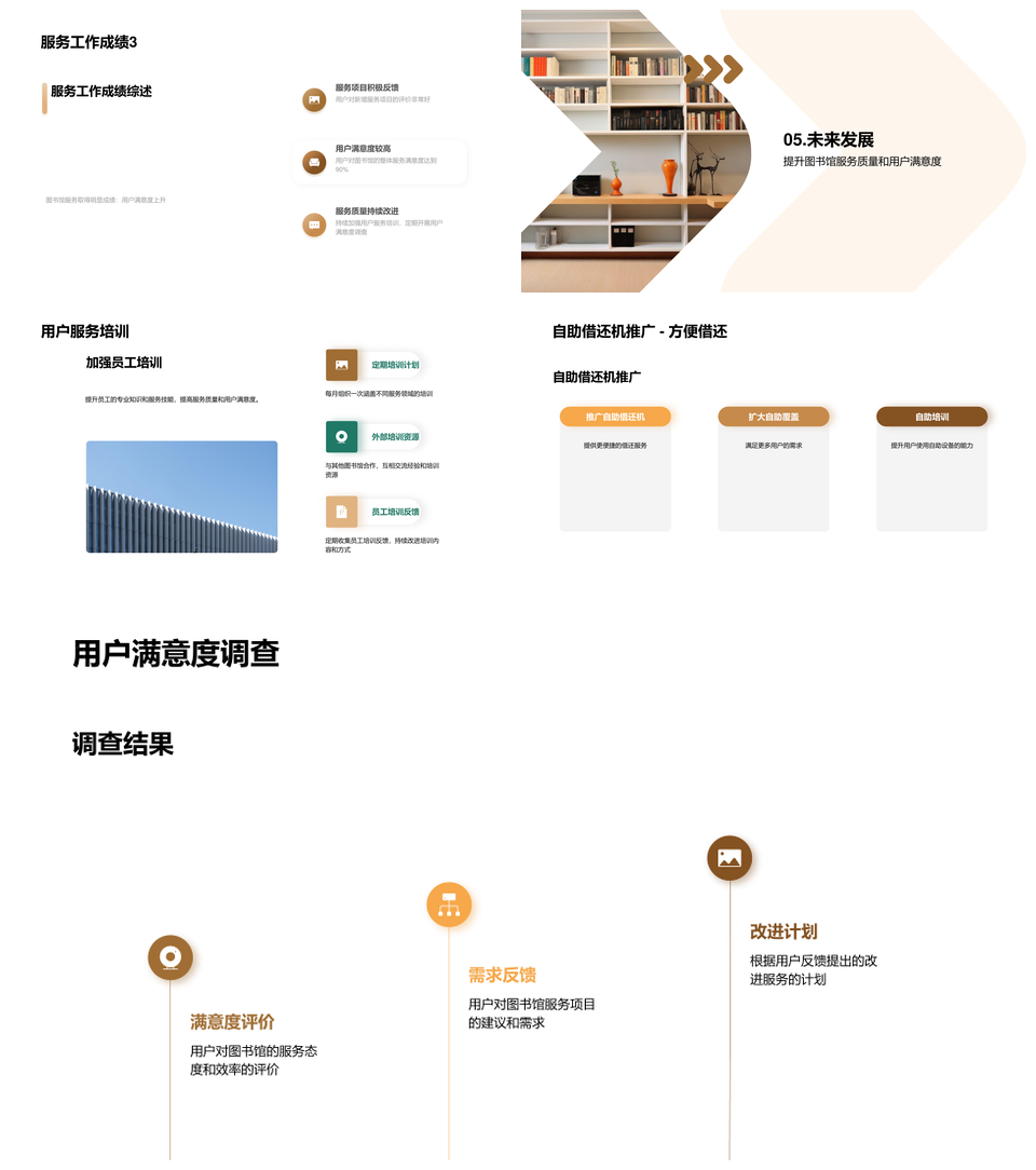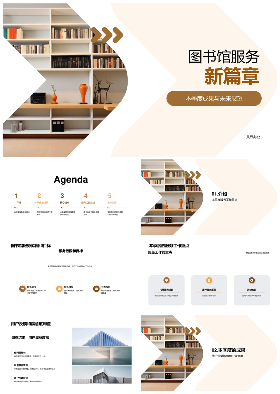 风云办公提供的图书馆本季服务创新成果用户满意PPT模板,下载格式为pptx,一共23页,作品中文字及图均可以修改和编辑,图片更改请在作品中右键图片并更换,文字修改请直接点击文字进行修改。