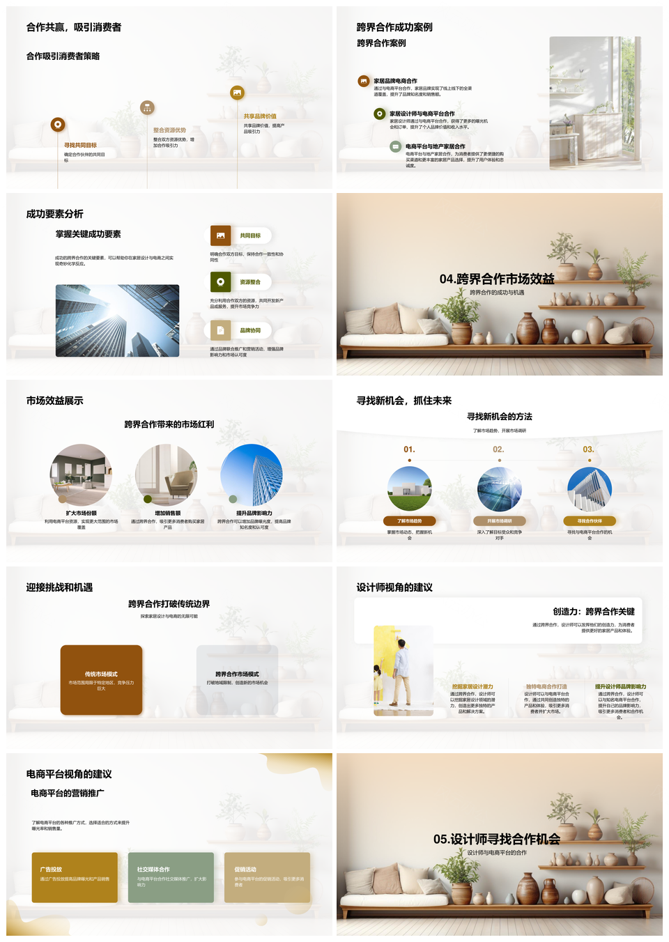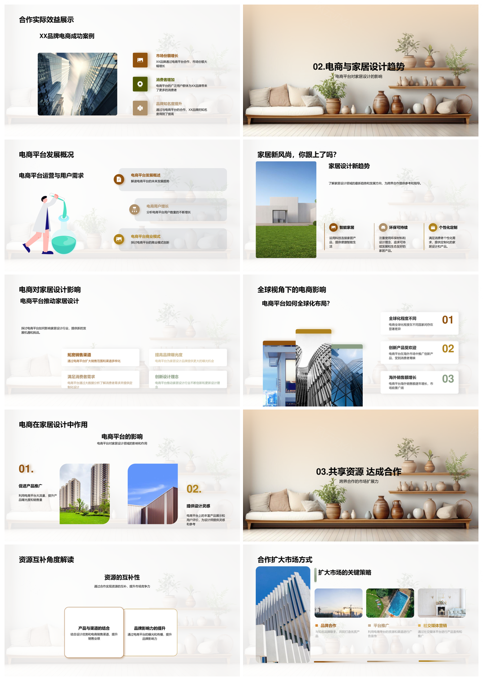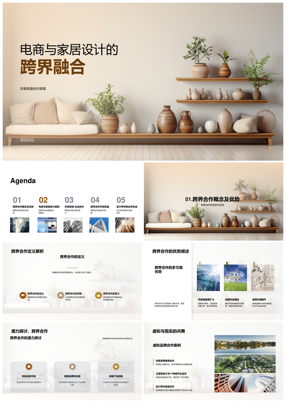 风云办公提供的电商家居设计跨界合作共享资源PPT模板,下载格式为pptx,一共33页,作品中文字及图均可以修改和编辑,图片更改请在作品中右键图片并更换,文字修改请直接点击文字进行修改。