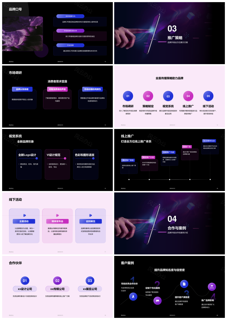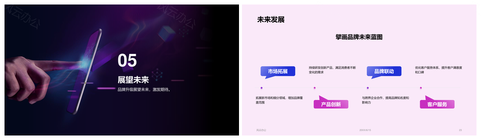 风云办公提供的紫色科技品牌升级发布会PPT模板,下载格式为pptx,一共20页,作品中文字及图均可以修改和编辑,图片更改请在作品中右键图片并更换,文字修改请直接点击文字进行修改。