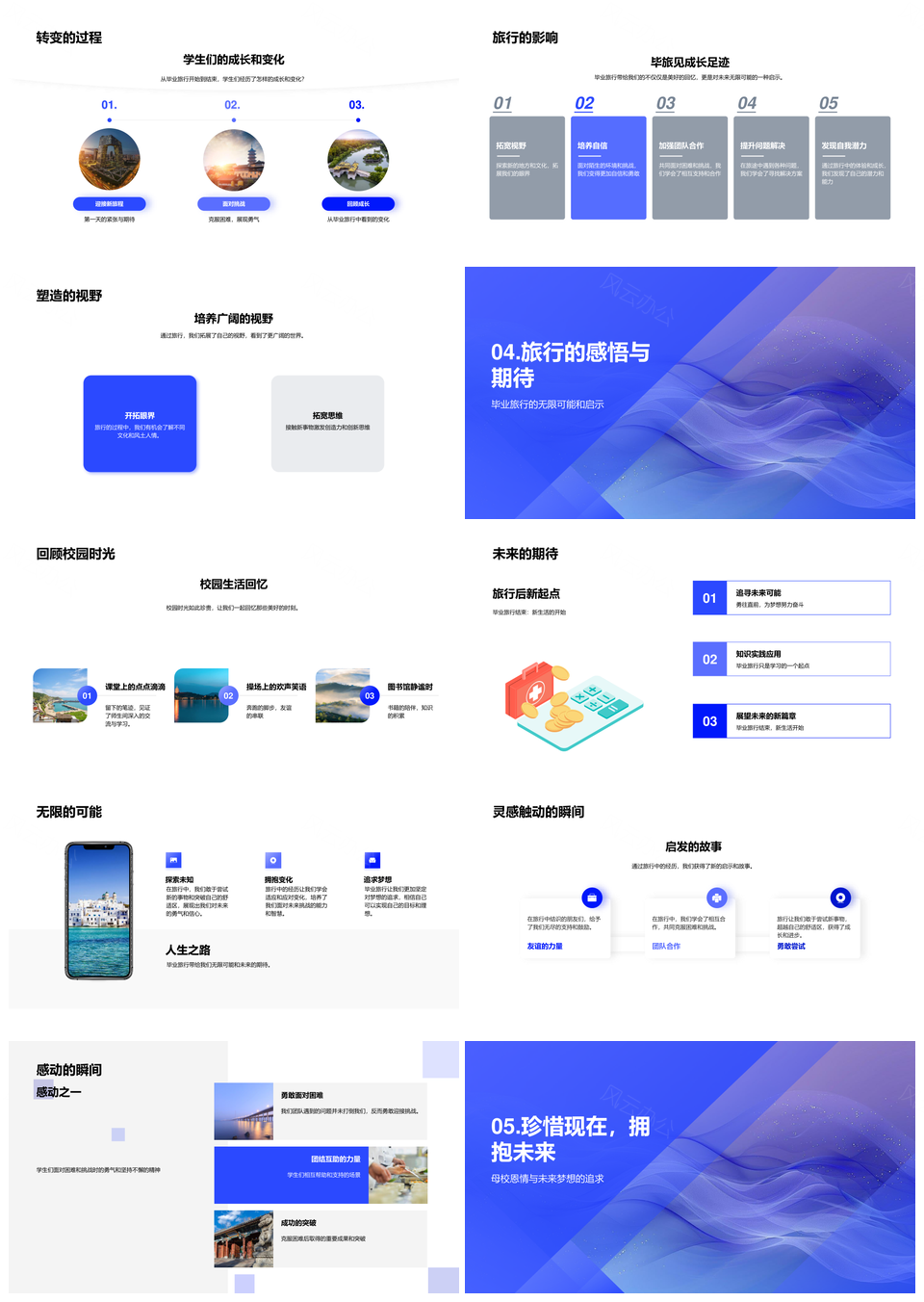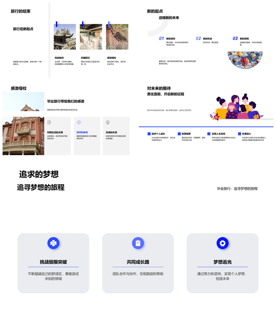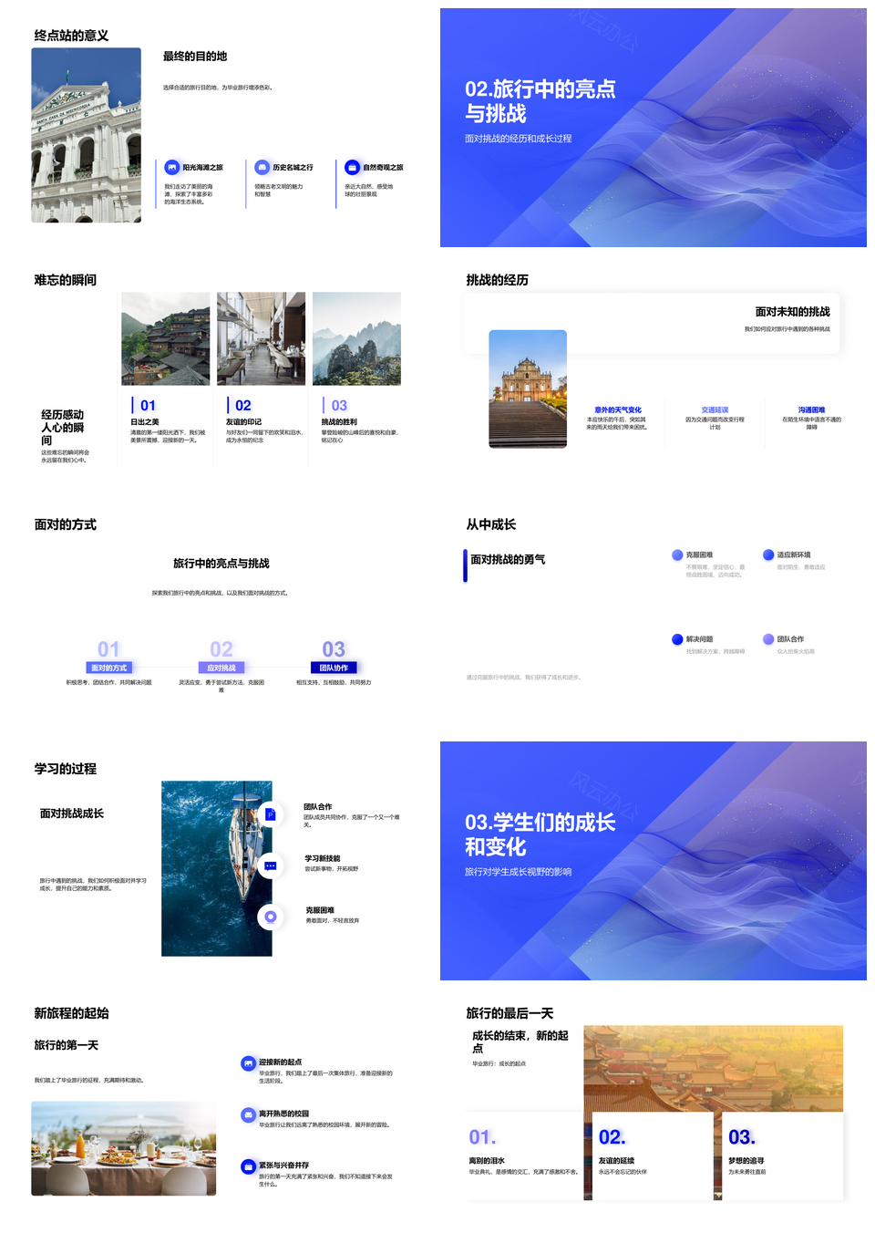 风云办公提供的毕业旅行成长挑战分享会母校时光行程PPT模板,下载格式为pptx,一共33页,作品中文字及图均可以修改和编辑,图片更改请在作品中右键图片并更换,文字修改请直接点击文字进行修改。