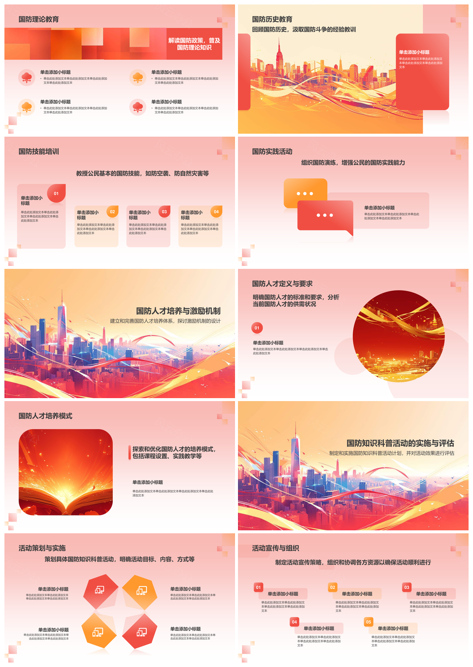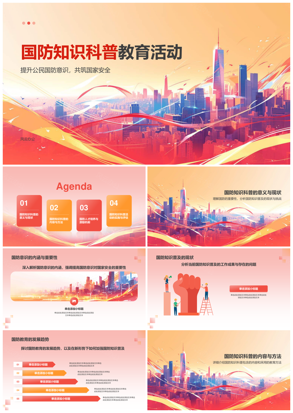 风云办公提供的国防教育国家安全人才培养公民参与PPT模板,下载格式为pptx,一共20页,作品中文字及图均可以修改和编辑,图片更改请在作品中右键图片并更换,文字修改请直接点击文字进行修改。