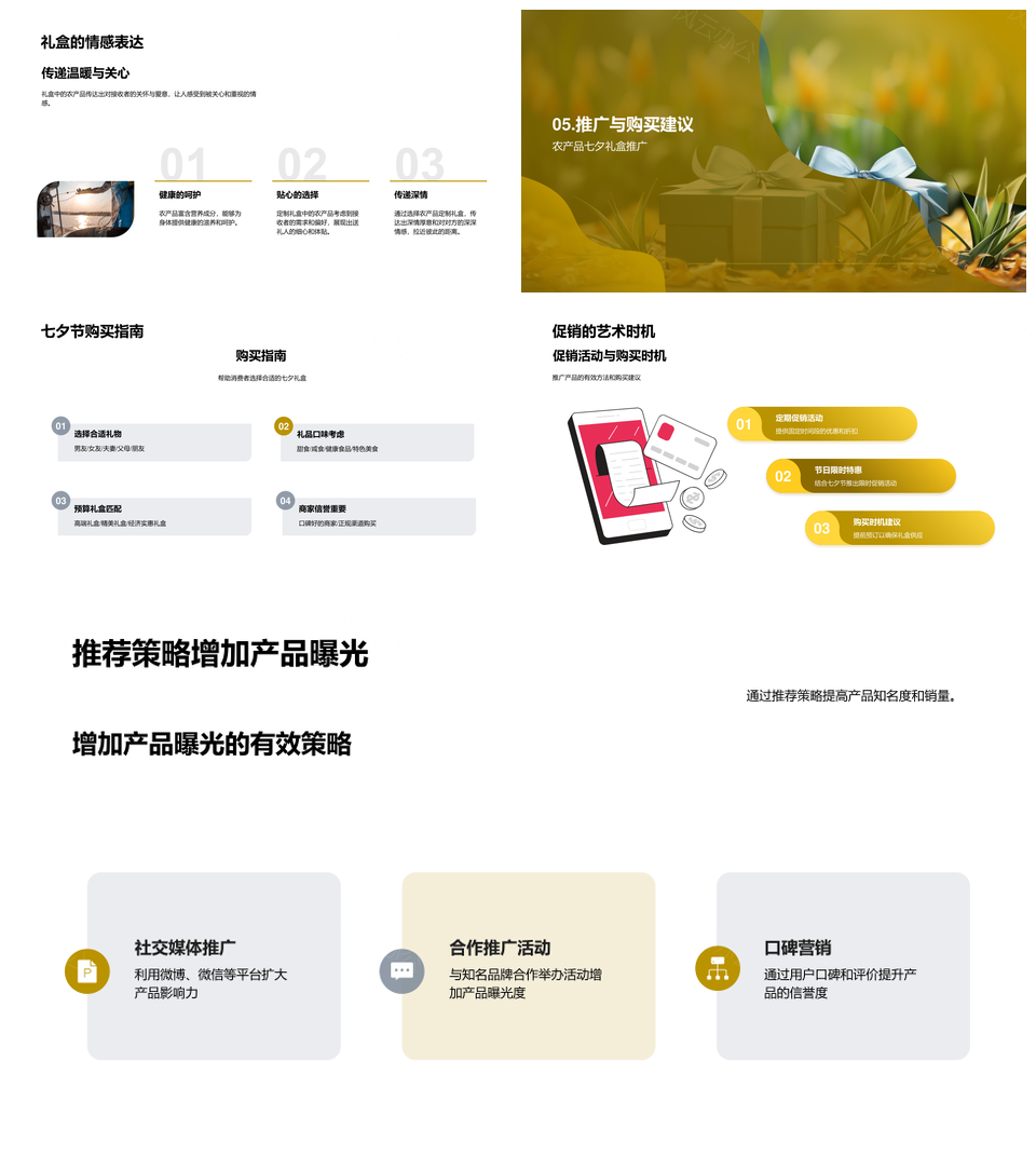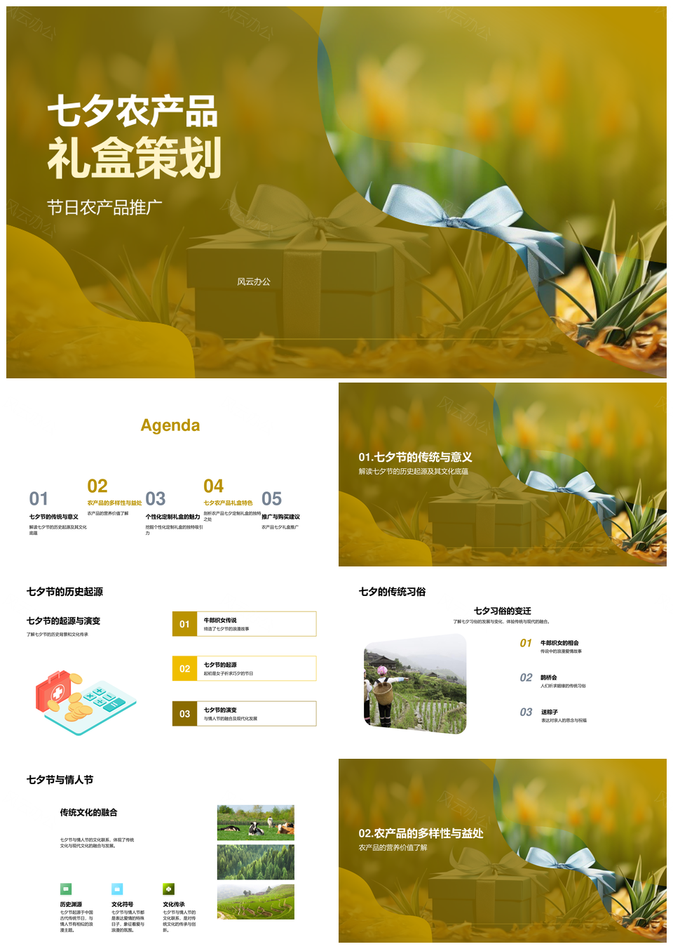 风云办公提供的七夕环保定制农产品礼盒策划推广PPT模板,下载格式为pptx,一共23页,作品中文字及图均可以修改和编辑,图片更改请在作品中右键图片并更换,文字修改请直接点击文字进行修改。