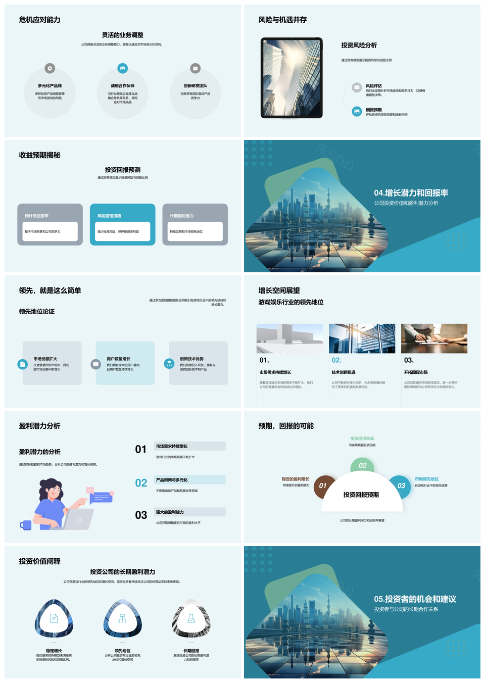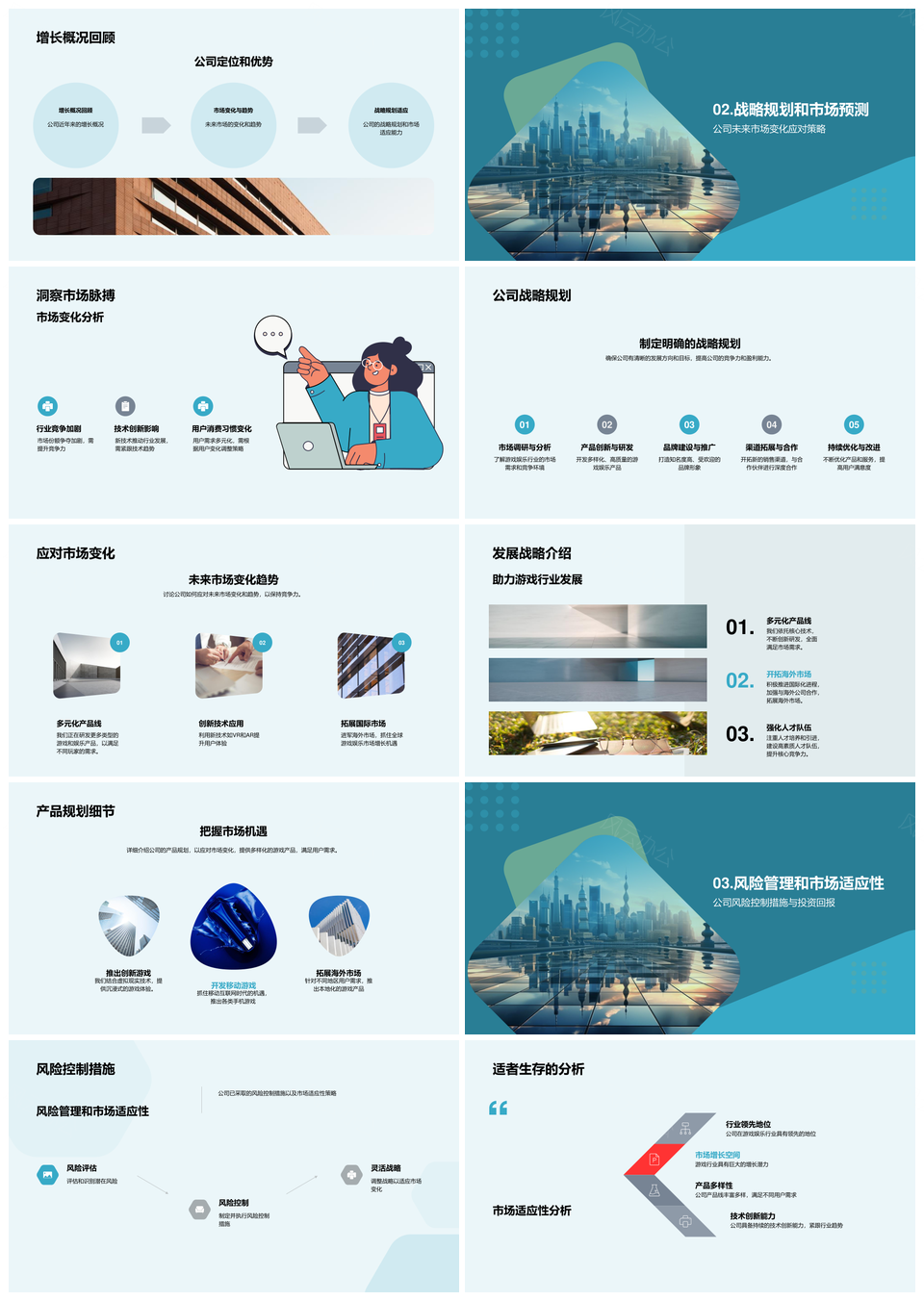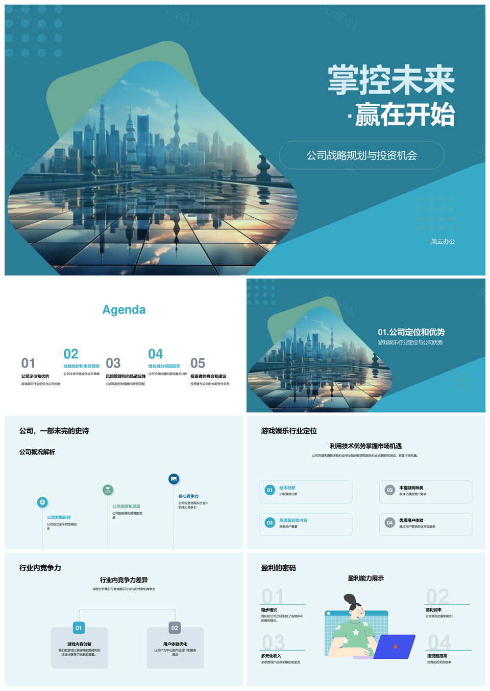 这是一张游戏战略投资市场定位增长风控适应未来天际盈利PPT模板,包含游戏、战略、投资、市场、定位、增长、风控、适应、未来、天际、盈利等主题内容,也可用作游戏战略投资市场、战略投资市场定位、市场定位增长风控、风控适应未来天际、适应未来天际盈利、战略投资市场增长、市场定位增长盈利、游戏战略投资定位、投资市场增长风控、定位增长风控适应、增长风控适应未来、风控适应天际盈利、战略投资增长风控、市场定位未来盈利、游戏战略风控盈利等PPT场景使用。 风云办公提供的游戏战略投资市场定位增长风控适应未来天际盈利PPT模板,下载格式为pptx,一共33页,作品中文字及图均可以修改和编辑,图片更改请在作品中右键图片并更换,文字修改请直接点击文字进行修改。