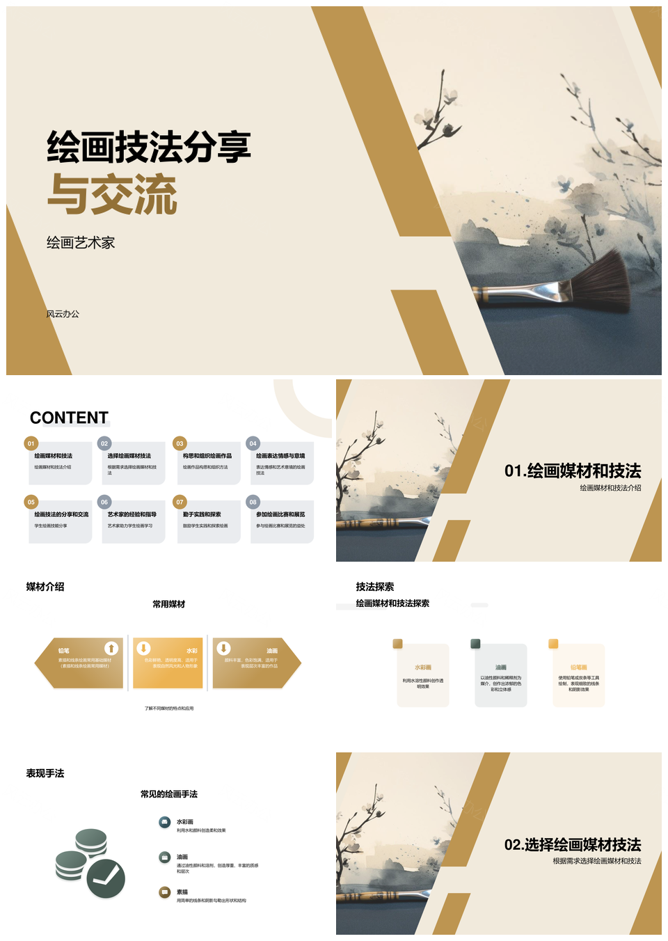 风云办公提供的艺术学院绘画技法媒材画笔分享交流PPT模板,下载格式为pptx,一共35页,作品中文字及图均可以修改和编辑,图片更改请在作品中右键图片并更换,文字修改请直接点击文字进行修改。