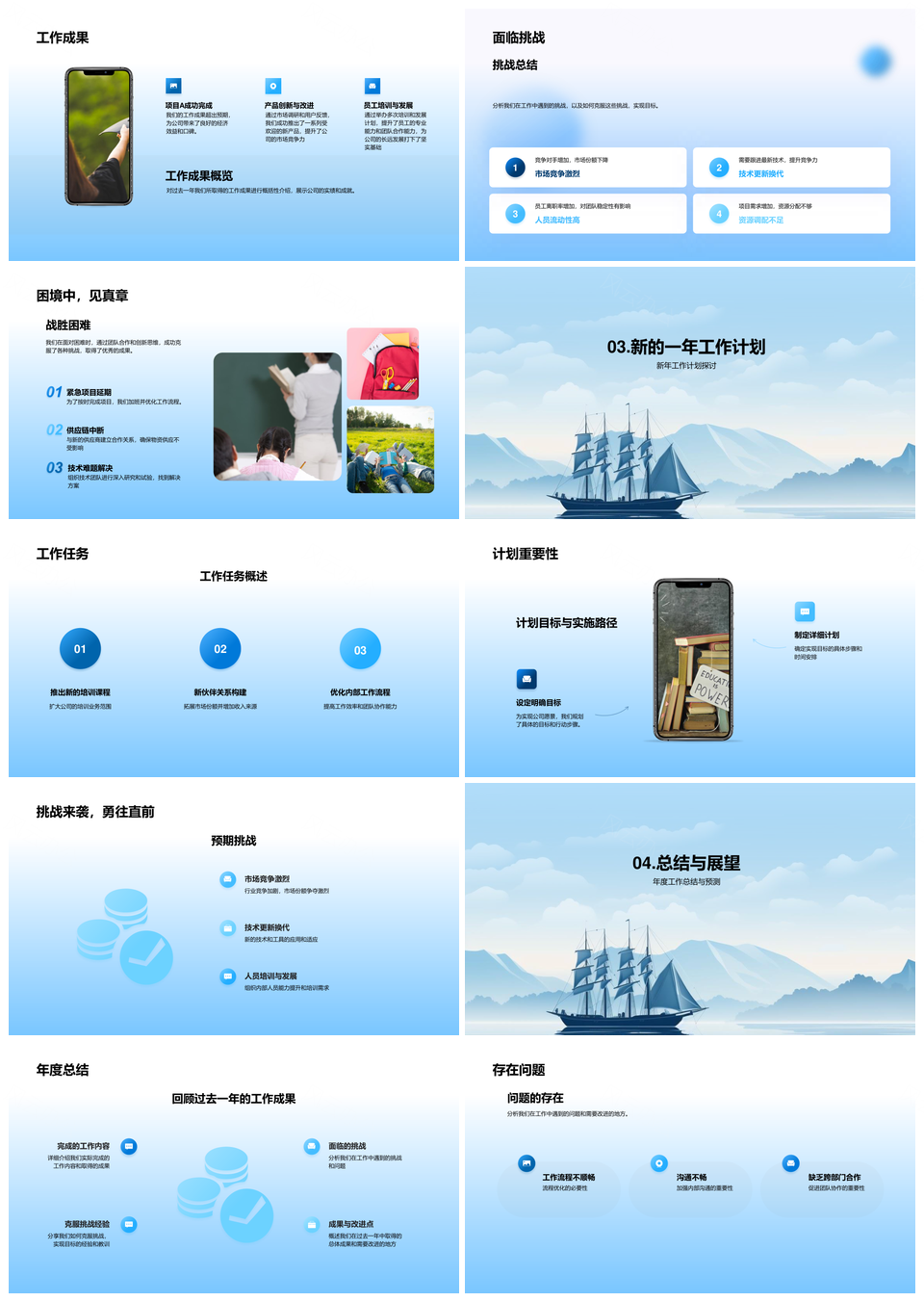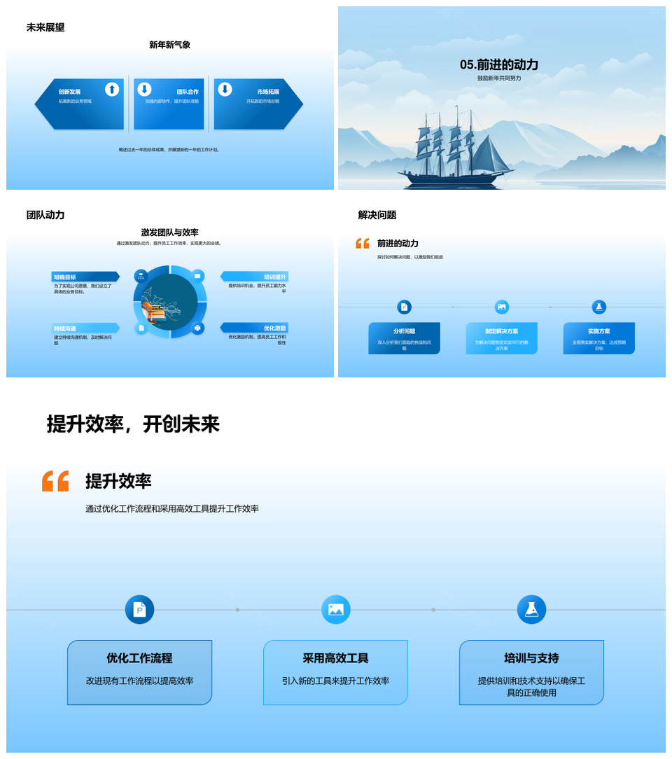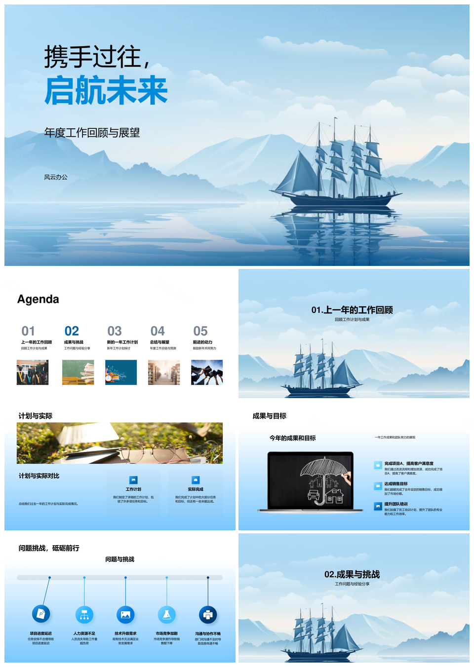 这是一张年度回顾展望扬帆启航新程PPT模板,包含年度、回顾、展望、扬帆、启航、新程等主题内容,也可用作年度回顾展望扬帆、回顾展望扬帆启航、展望扬帆启航新程、年度回顾展望、回顾展望扬帆、展望扬帆启航、扬帆启航新程、年度回顾、回顾展望、展望扬帆、扬帆启航、启航新程、年度展望、回顾扬帆、扬帆新程等PPT场景使用。 风云办公提供的年度回顾展望扬帆启航新程PPT模板,下载格式为pptx,一共23页,作品中文字及图均可以修改和编辑,图片更改请在作品中右键图片并更换,文字修改请直接点击文字进行修改。