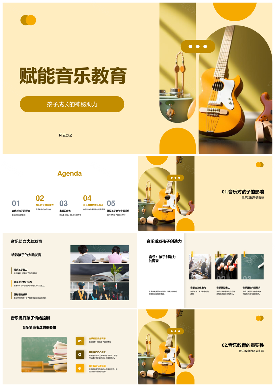 风云办公提供的音乐教育启智育情培创协作促成长PPT模板,下载格式为pptx,一共23页,作品中文字及图均可以修改和编辑,图片更改请在作品中右键图片并更换,文字修改请直接点击文字进行修改。