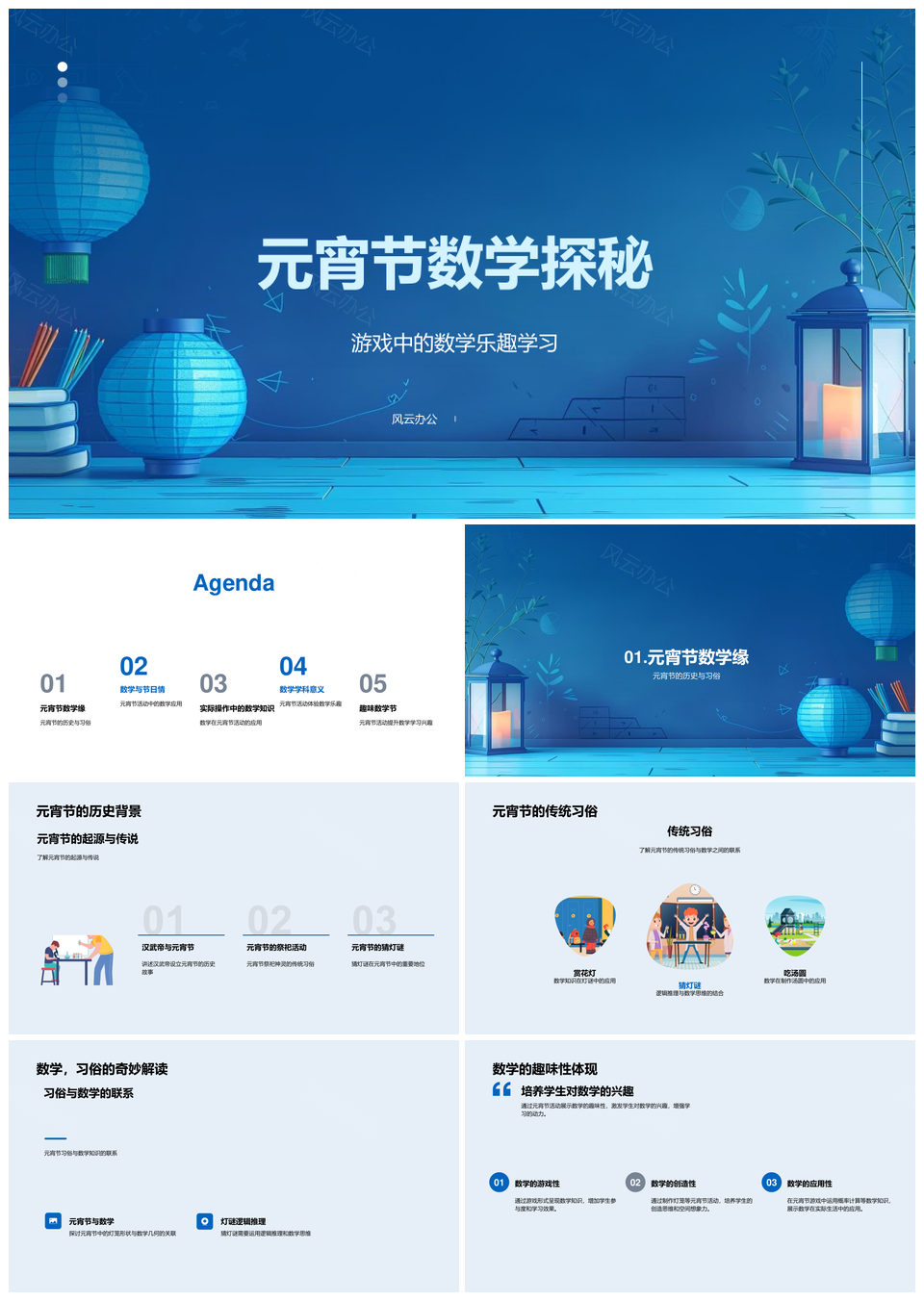 风云办公提供的2025元宵数学灯谜趣味逻辑游戏PPT模板,下载格式为pptx,一共24页,作品中文字及图均可以修改和编辑,图片更改请在作品中右键图片并更换,文字修改请直接点击文字进行修改。