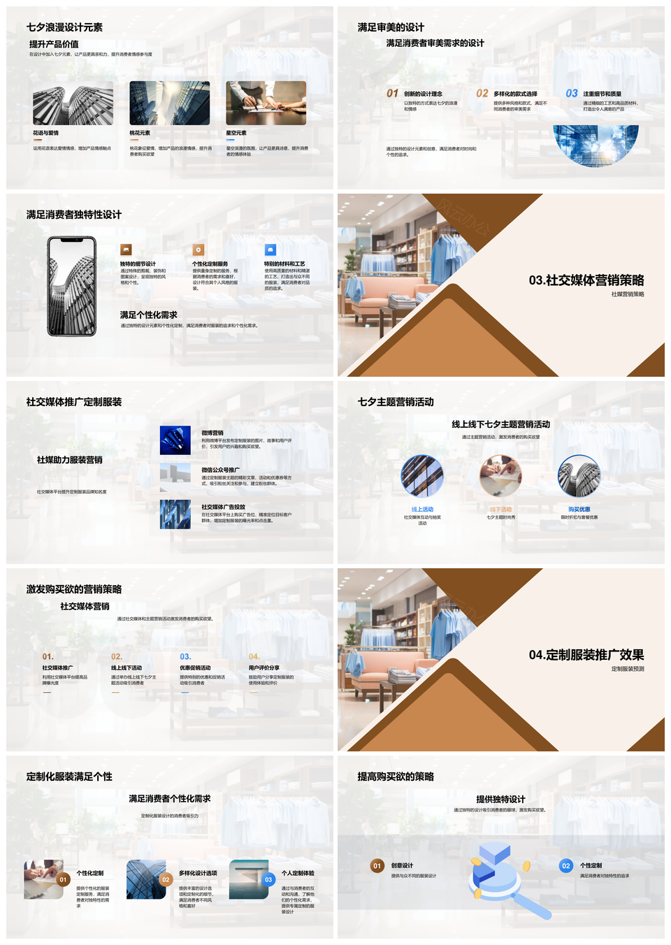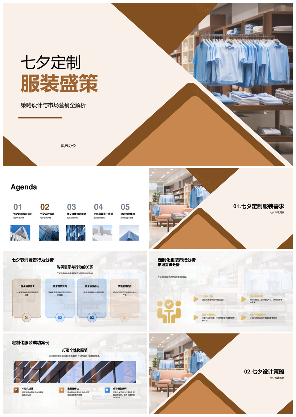 风云办公提供的七夕定制服装主题营销策略设计推广PPT模板,下载格式为pptx,一共23页,作品中文字及图均可以修改和编辑,图片更改请在作品中右键图片并更换,文字修改请直接点击文字进行修改。