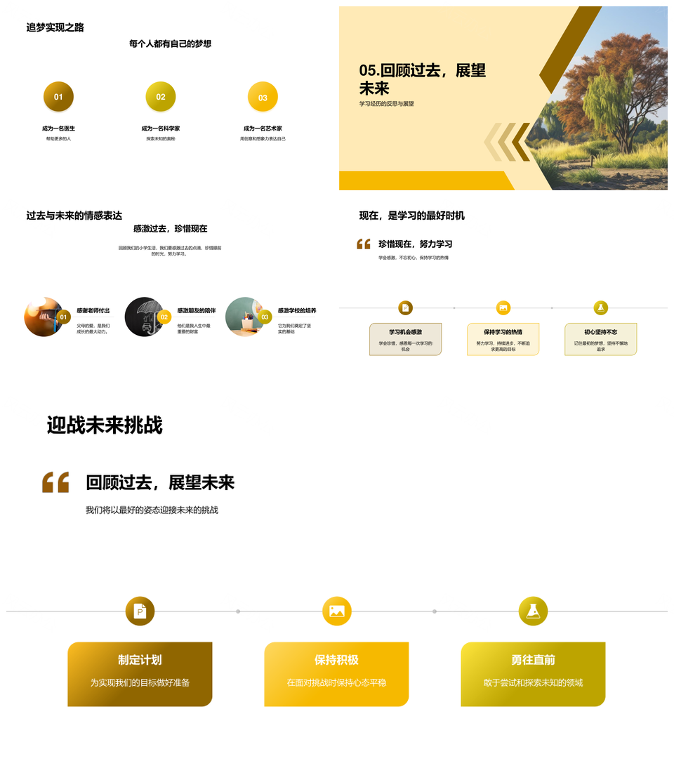 这是一张旧校逐梦成长师恩学用点滴PPT模板,包含旧校、逐梦、成长、师恩、学用、点滴等主题内容,也可用作旧校逐梦成长点滴、逐梦成长师恩点滴、旧校逐梦师恩点滴、旧校逐梦成长、逐梦成长师恩、成长师恩点滴、旧校师恩点滴、逐梦成长点滴、旧校逐梦、逐梦成长、成长师恩、师恩点滴、旧校师恩、旧校点滴、逐梦点滴等PPT场景使用。 风云办公提供的旧校逐梦成长师恩学用点滴PPT模板,下载格式为pptx,一共23页,作品中文字及图均可以修改和编辑,图片更改请在作品中右键图片并更换,文字修改请直接点击文字进行修改。