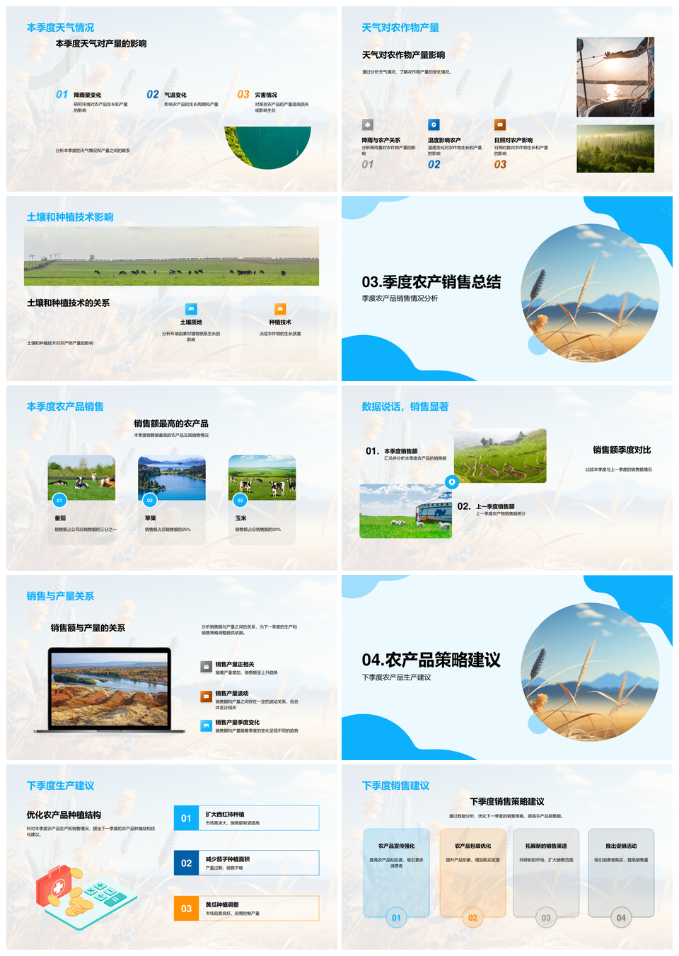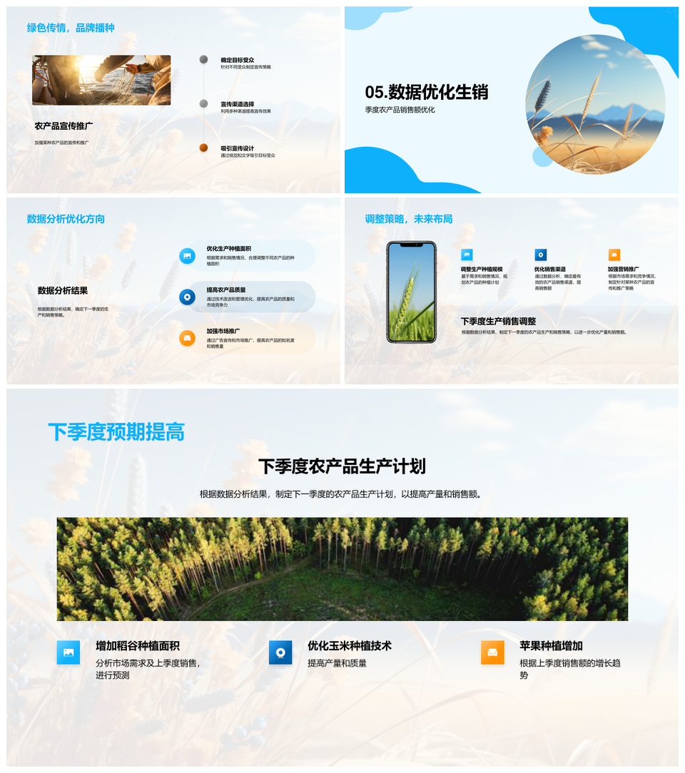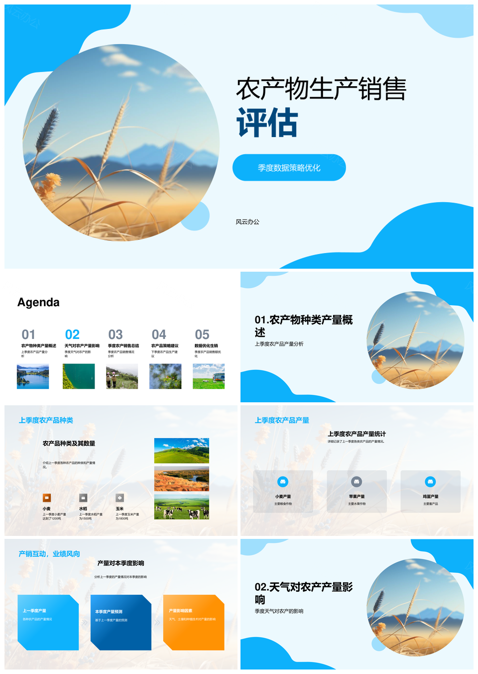 风云办公提供的小麦田季度产销数据优化策略分析PPT模板,下载格式为pptx,一共23页,作品中文字及图均可以修改和编辑,图片更改请在作品中右键图片并更换,文字修改请直接点击文字进行修改。