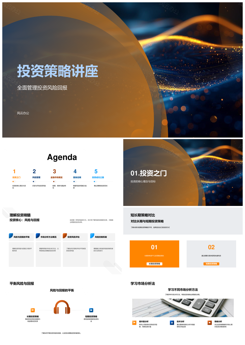 这是一张投资策略风险管理市场分析长短期股债期权期货风险回报PPT模板,包含投资策略、风险管理、市场分析、长短期、股债、期权、期货、风险回报等主题内容,也可用作风险管理市场分析长短期股债、股债期权期货风险回报、投资策略风险管理、市场分析长短期股债、股债期权期货、长短期股债期权、风险管理股债期权、市场分析股债期权、投资策略股债期权、期权期货风险回报、风险回报投资策略、风险管理市场分析、期货风险回报、风险回报投资、投资策略市场分析等PPT场景使用。 风云办公提供的投资策略风险管理市场分析长短期股债期权期货风险回报PPT模板,下载格式为pptx,一共33页,作品中文字及图均可以修改和编辑,图片更改请在作品中右键图片并更换,文字修改请直接点击文字进行修改。